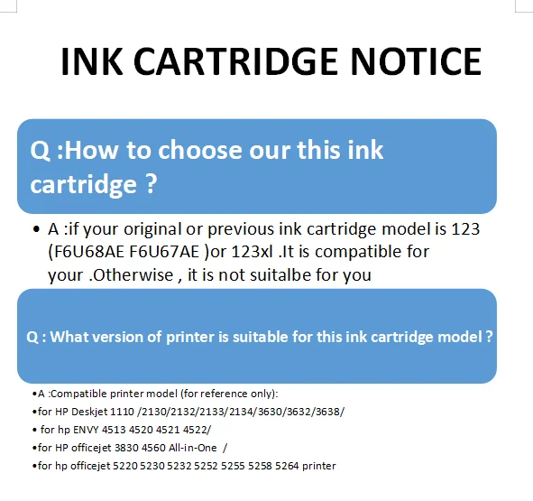 Убедитесь, что ваша модель принтера находится в описании списка (Ctrl + F), а ваша оригинальная или предыдущая модель чернильного картриджа-«123» или «123»XL"; Если не 123 или 123xl, наш продукт не подойдет для вашего принтера