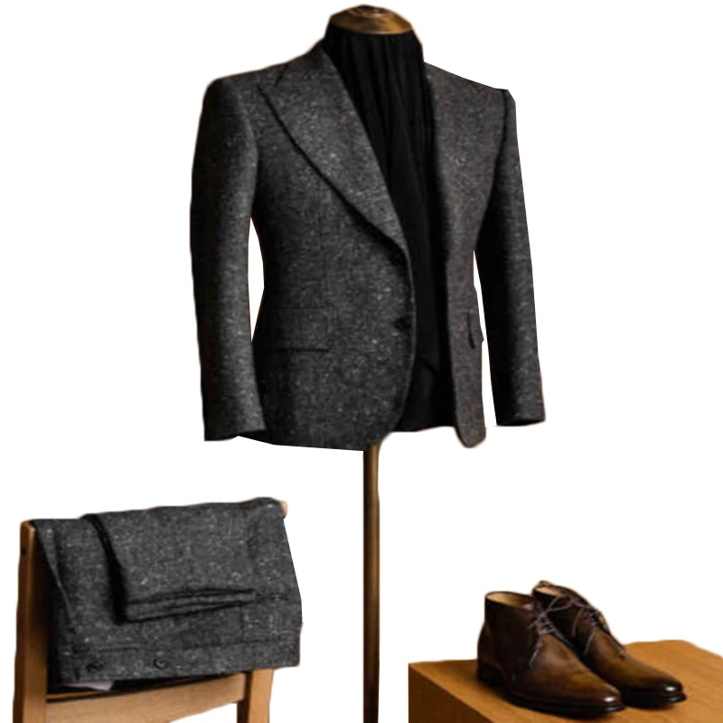 Мужские Твидовые костюмы с отложным воротником, темно-серые классические шерстяные костюмы из двух пуговиц, винтажные приталенные костюмы для зимы, 2019