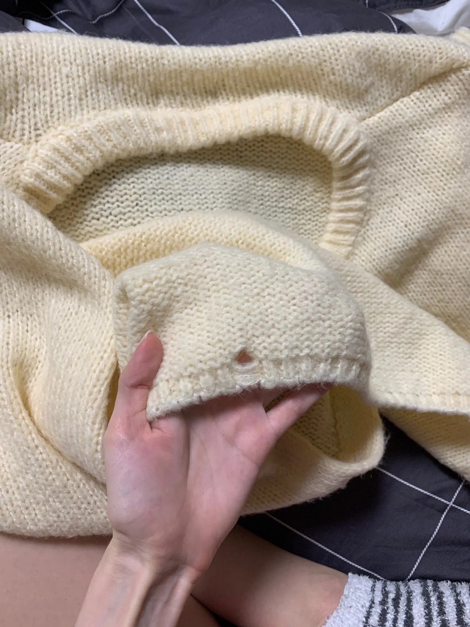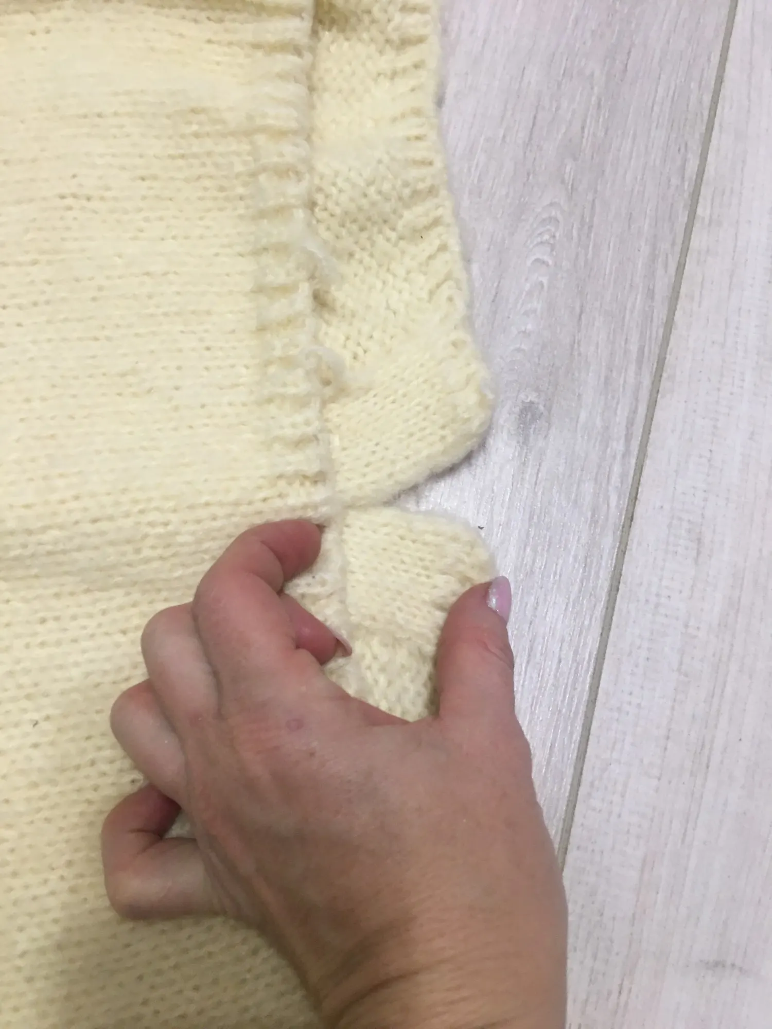 Качество вязки оставляет желать лучше,кривой низ и торчали нитки .Но по ощущениям очень приятная вещь .Открыла спор ,часть денег вернули ,в заправленном виде буду носить .Продавец вежливый .товар пришёл за 12 дней до Краснодара .На мой рост 153 и вес 50 кг очень оверсайз.Цвет кремовый очень красивый