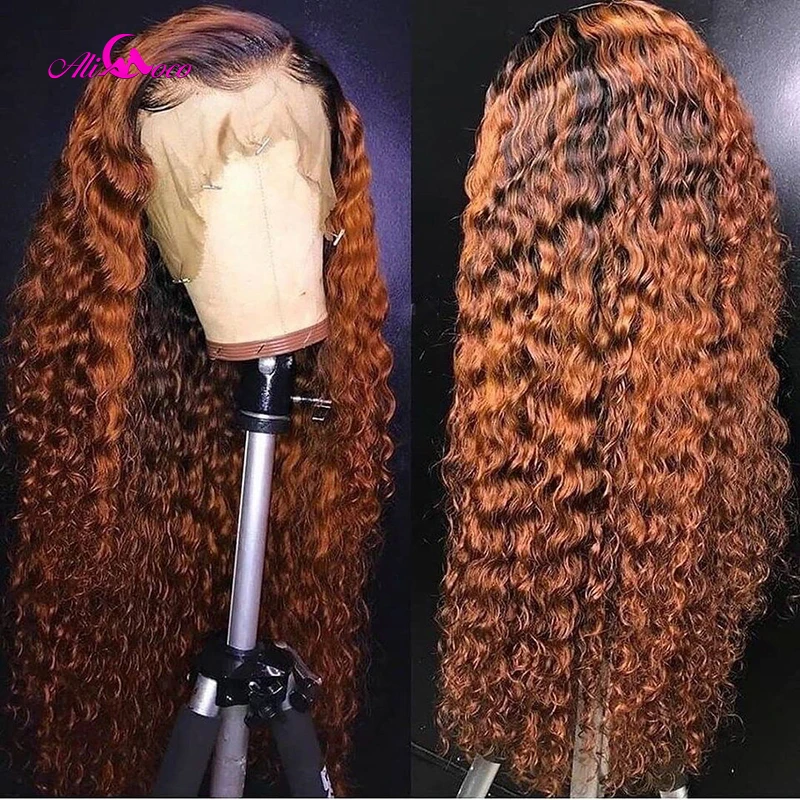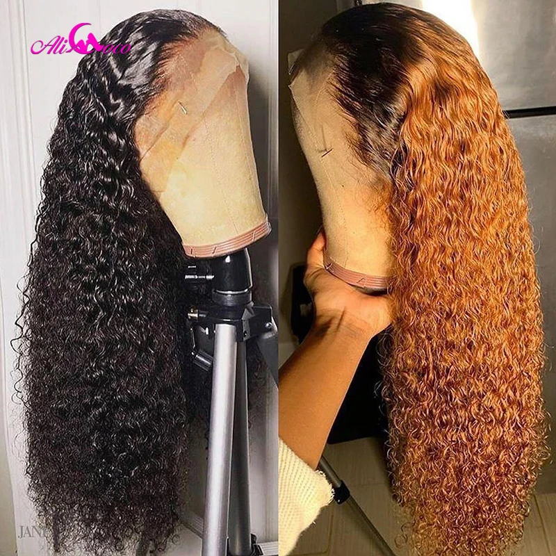Ali Coco блонд кудрявые человеческие волосы на шнуровке передние парики 180% Плотность оранжевый имбирь Омбре цвет бразильский Реми кудрявые парики предварительно выщипанные