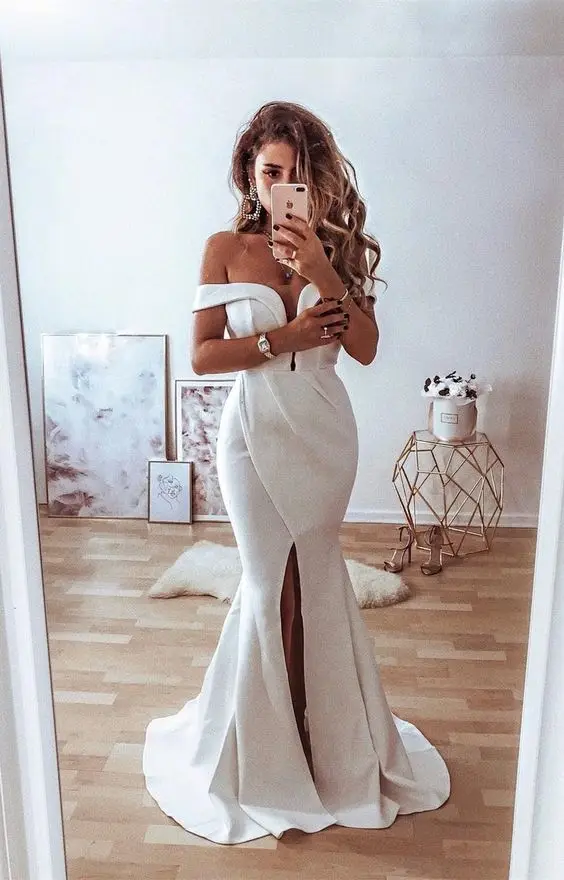Женское свадебное платье с юбкой-годе, разрезом спереди и открытыми плечами