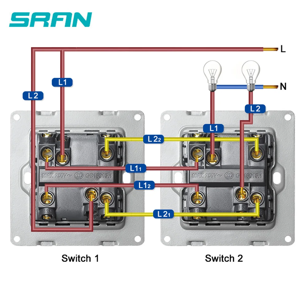 Настенный выключатель SRAN UK, 2 клавиши, 12 канала, 250 В, 16 А, акриловый, белыйчерныйзолотистый, с серебристым краем, 86 мм * 86 мм