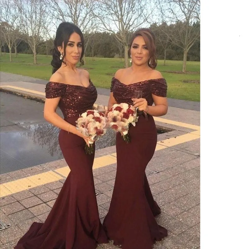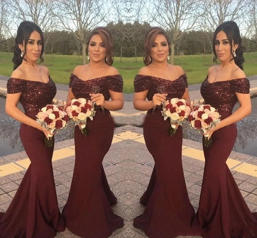 Бордовые Платья для подружки невесты, топ с блестками русалки, эластичная атласная юбка с открытыми плечами, свадебные платья для подружки невесты