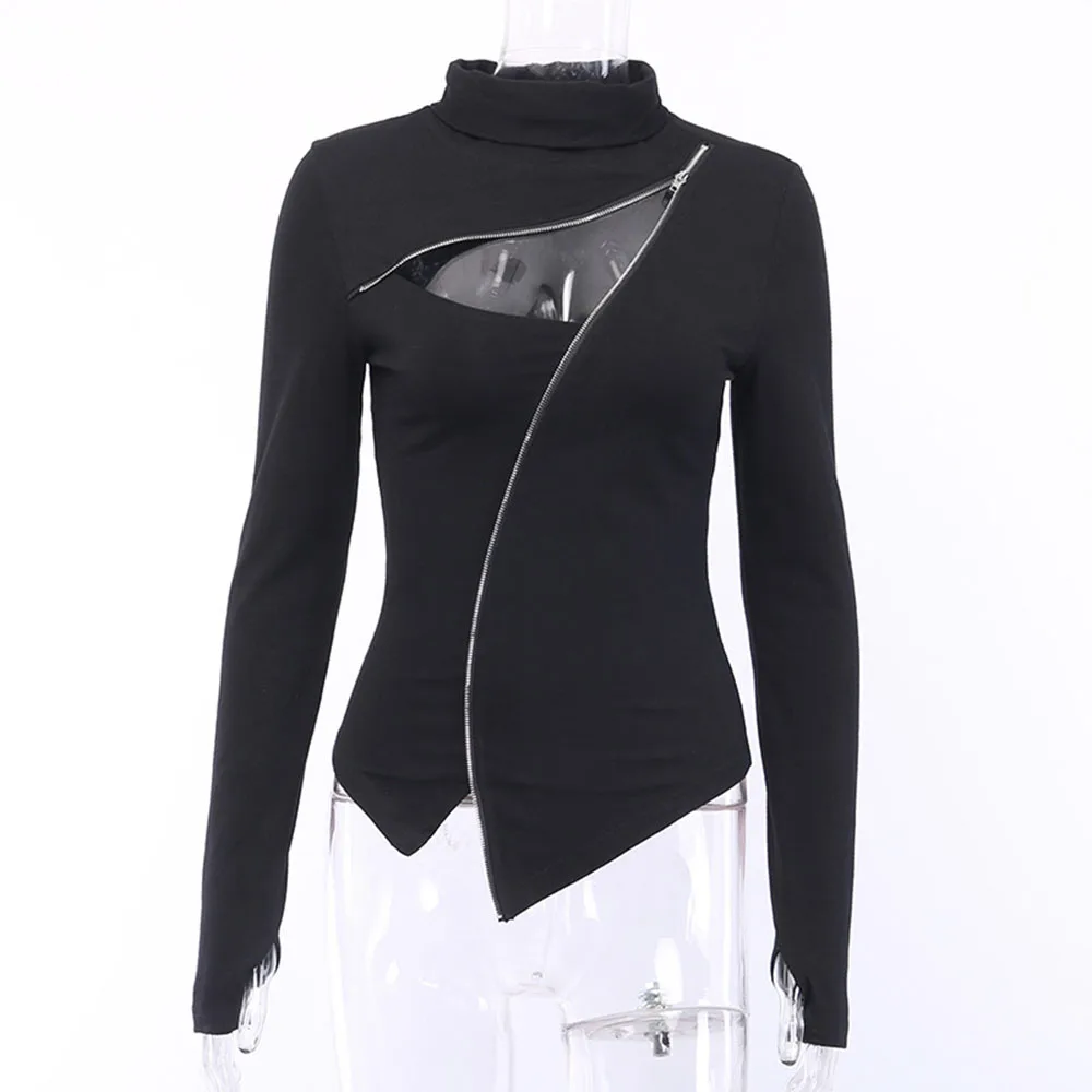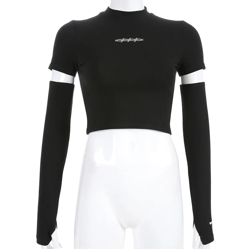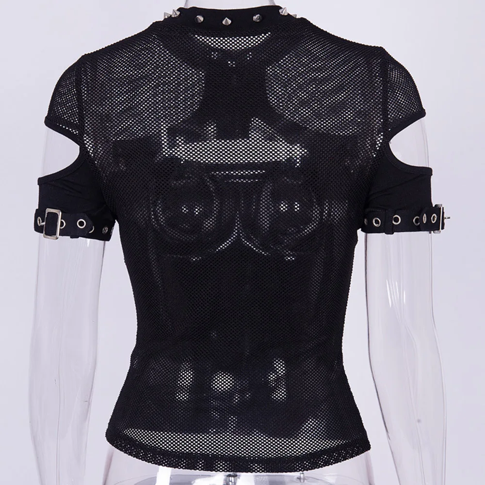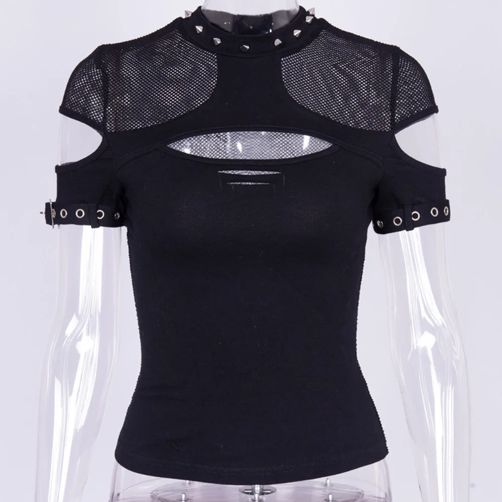 Rosetic 2020 Готический сексуальный короткий топ, прозрачный сетчатый топ, футболка с длинным рукавом, Женская водолазка с металлическим воротником, футболки в стиле панк, уличная футболка