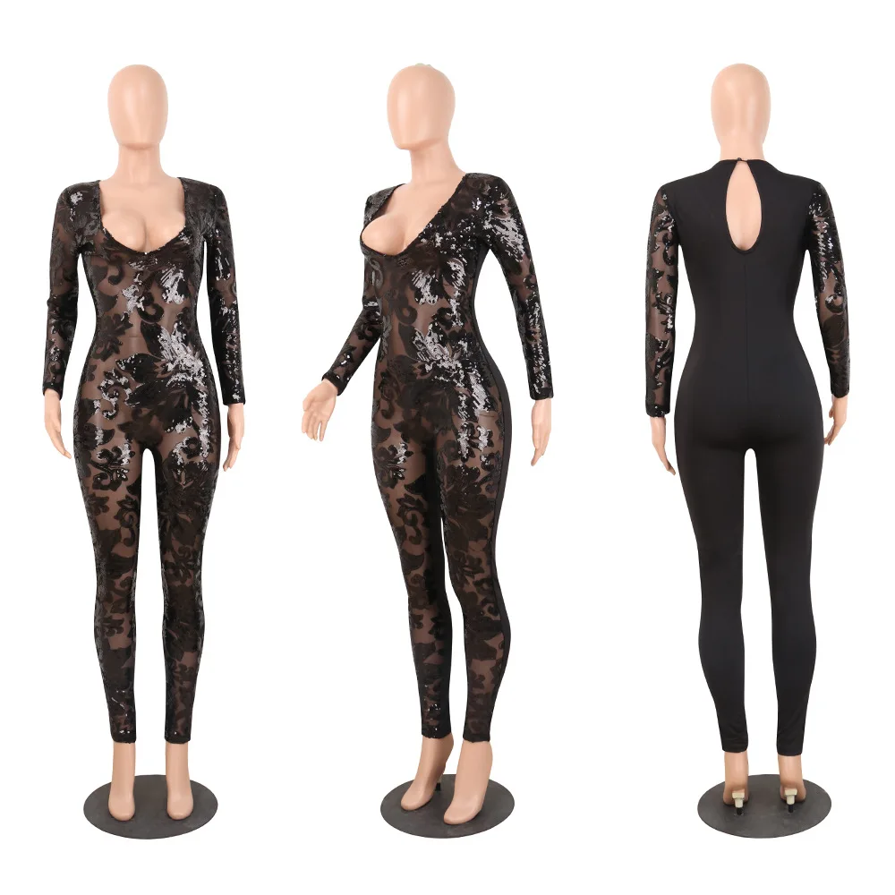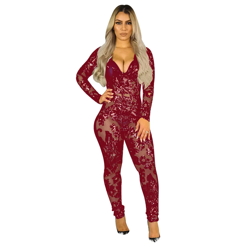 Женский кружевной комбинезон с блестками Echoine, черный пикантный облегающий боди с длинным рукавом, Клубные красные рождественские боди размера плюс