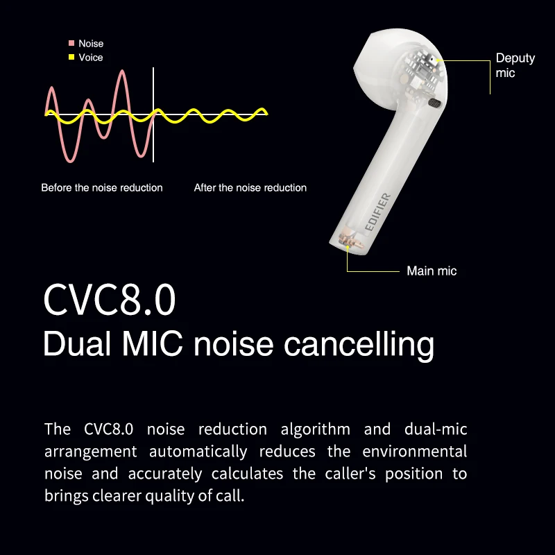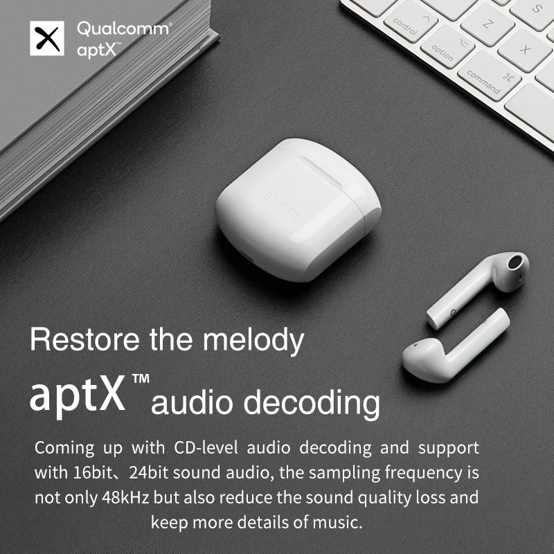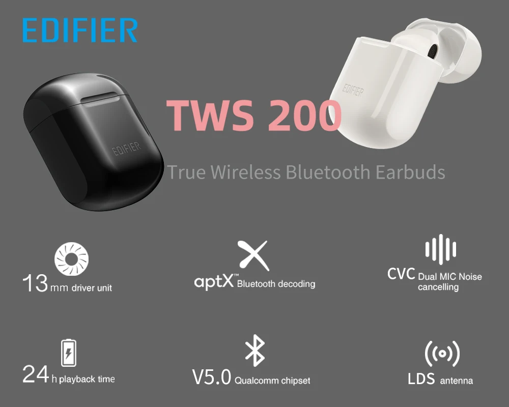 TWS-наушники EDIFIER TWS200, Qualcomm aptX, Bluetooth 5,0, ШПД, шумоподавление, время воспроизведения 24 часа