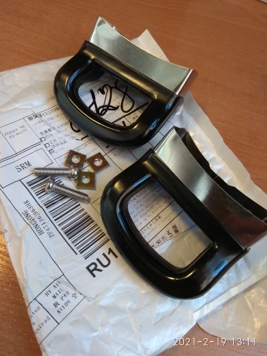 Заказ пришел за 13 дней, что очень понравилось. Не ожидал такой быстроты. Одна ручка в отличном состоянии, вторая со сколом, но успокаивает то что металлическая накладка закрывает этот дефект. Винтов крепления всего два и три закладных. На ощупь приятные, без заусенцев от литья.