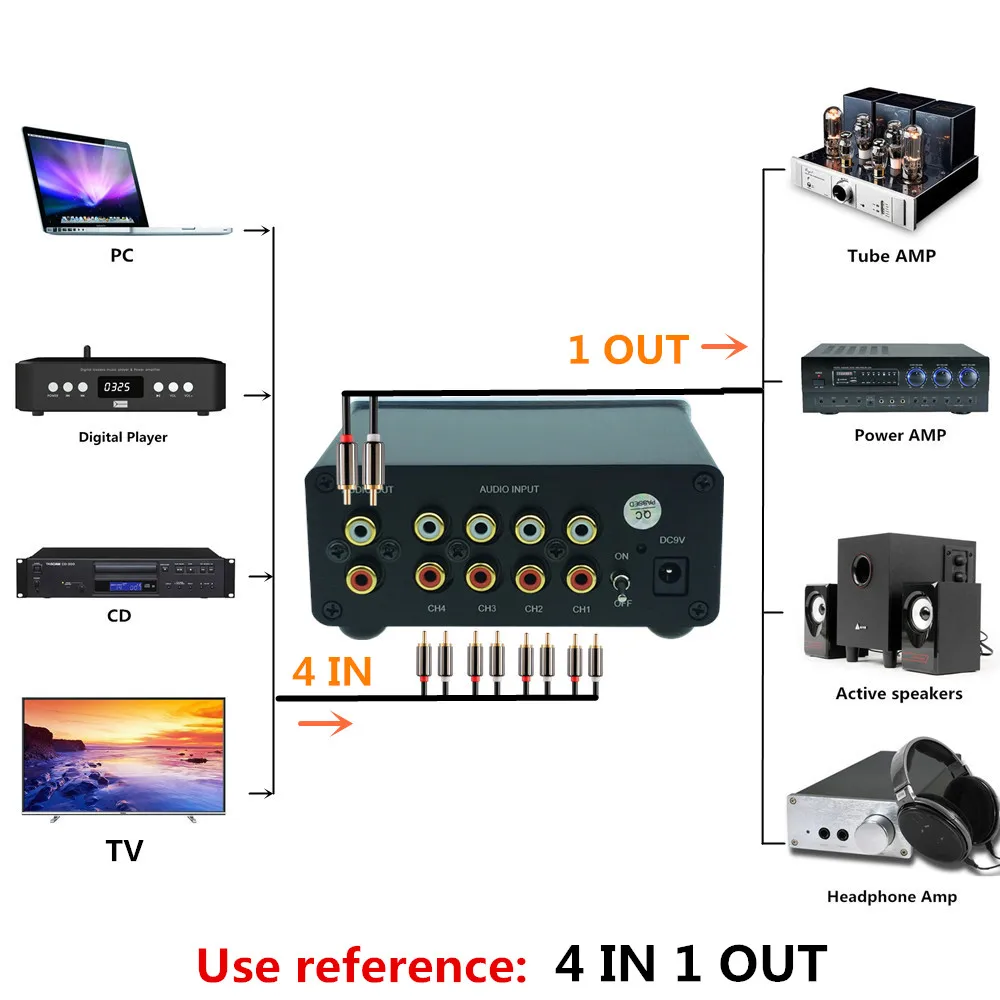4 (1) в 1 (4) Выход, 4-канальный аудиовход, кабель RCA, разветвитель, селектор, переключатель, переключатель, блок распределителя исходного разъема