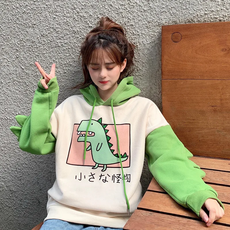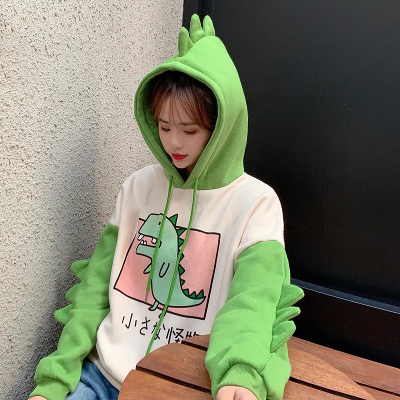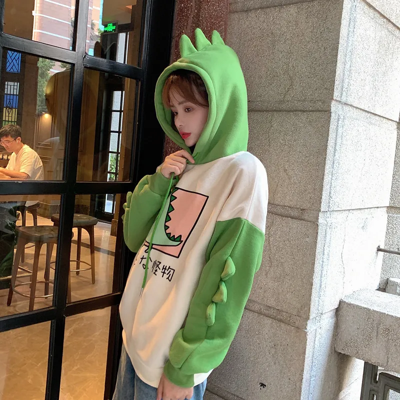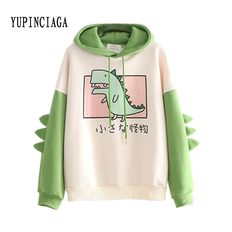 Женский теплый пуловер YUPINCIAGA с капюшоном и принтом динозавра, толстый флисовый Свитшот хит продаж, толстовка с рогами в стиле Харадзюку для подростков и девушек