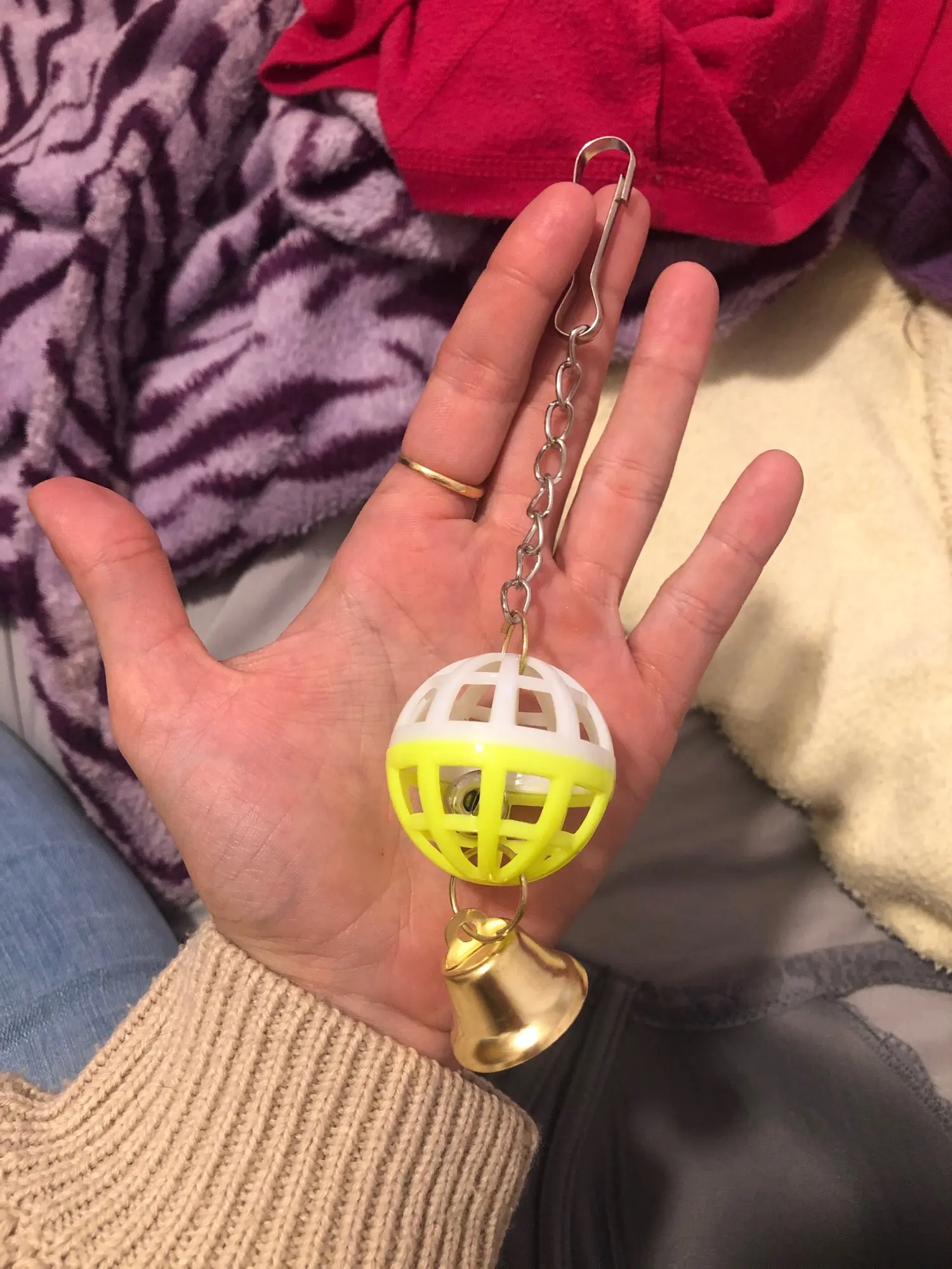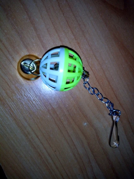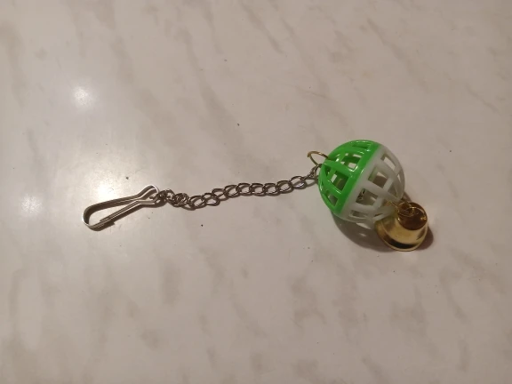 Моей любимице нравится играть с колокольчиком, так что нашла этот товар интересным. Внутри имеется ещё один колокольчик связанный с тем что снаружи, звук приятный. Цепочка без дефектов, крепление внушает доверие(а это важно потому что прошлая игрушка долго не прослужила: колокольчик жестоко уничтожили как и крепление) Цвет понравился. Доставка быстрая. Благодарю!