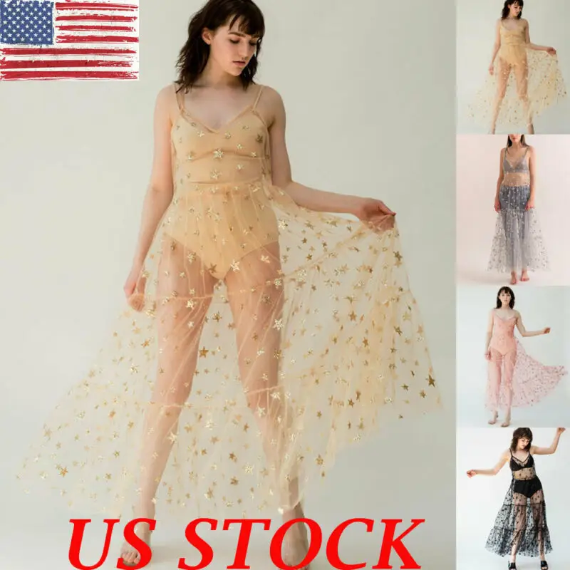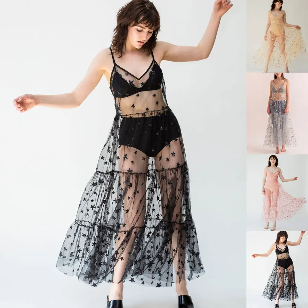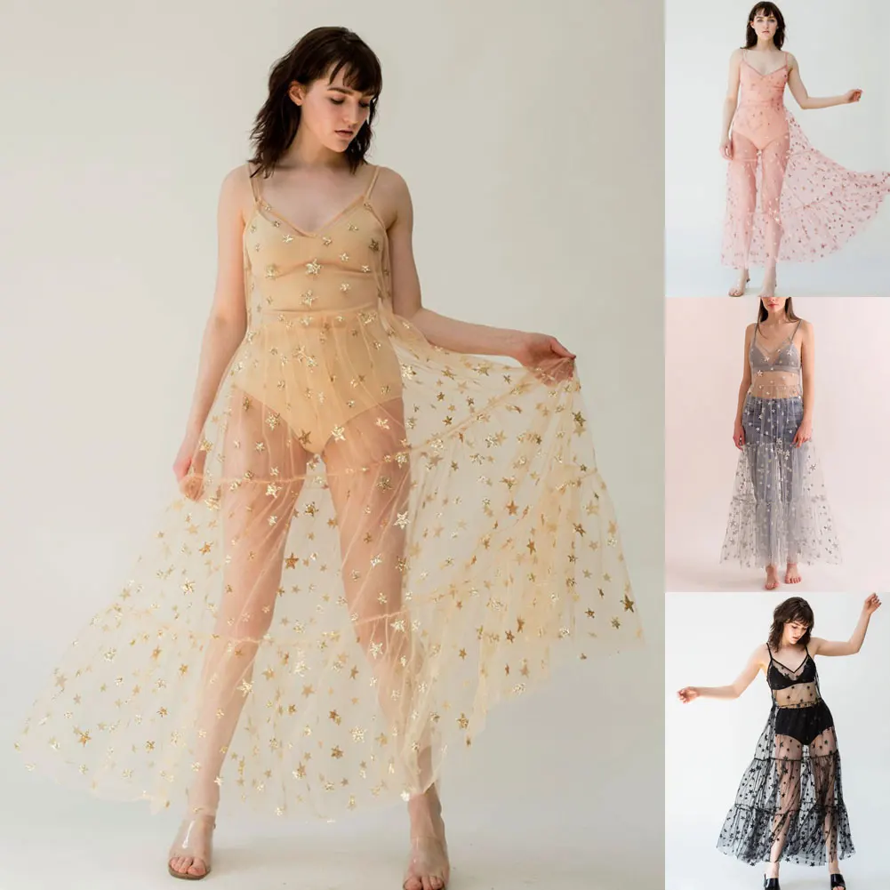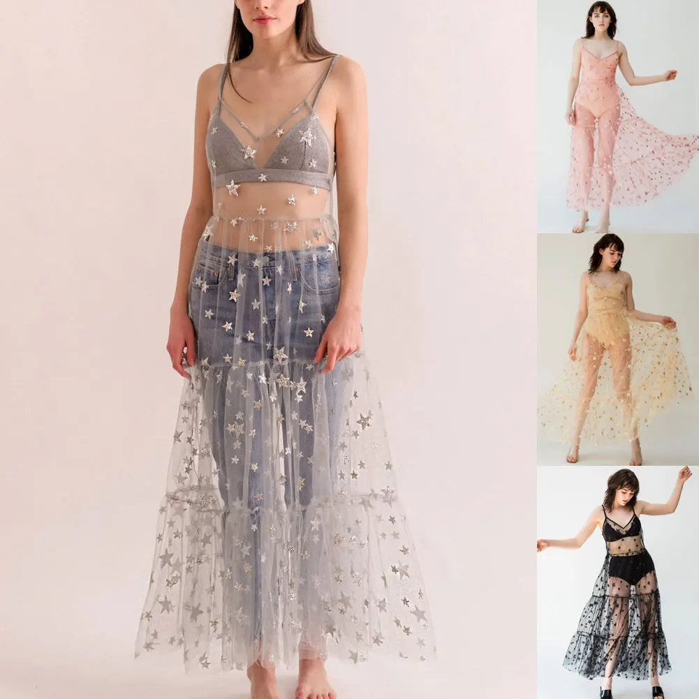 Сексуальное Сетчатое Прозрачное платье-макси Hirigin на бретелях-спагетти с принтом звезд и V-образным вырезом, летнее пляжное прозрачное повседневное свободное платье для купания