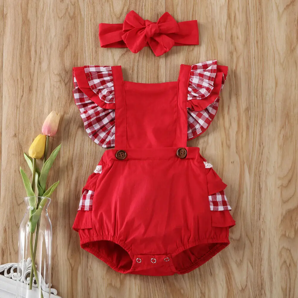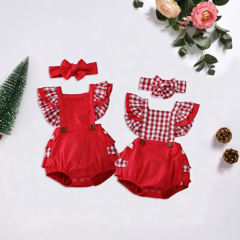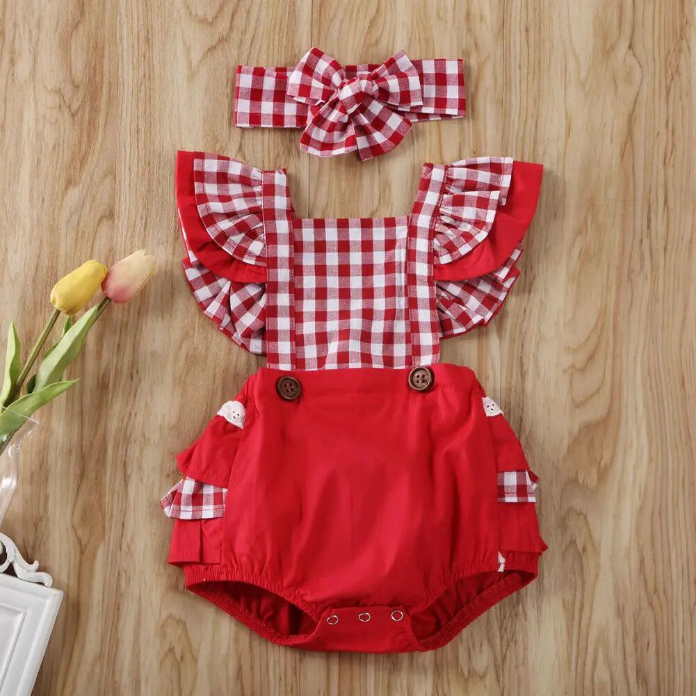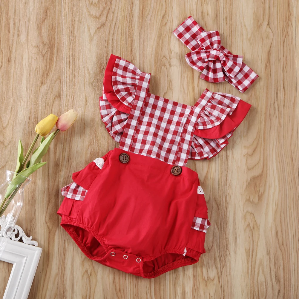 2 шт. для младенцев, для маленьких девочек Рождественский комбинезон и повязка на голову 2 шт. с низким вырезом на спине с оборками на рукавах, в клетку, с принтом Комбинезон, комбинезон, комплект одежды, летний пляжный костюм