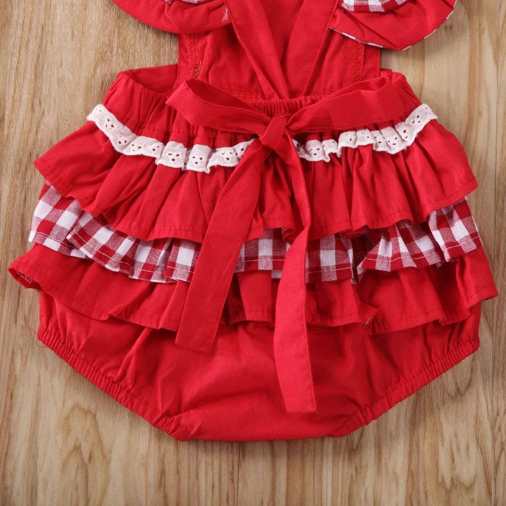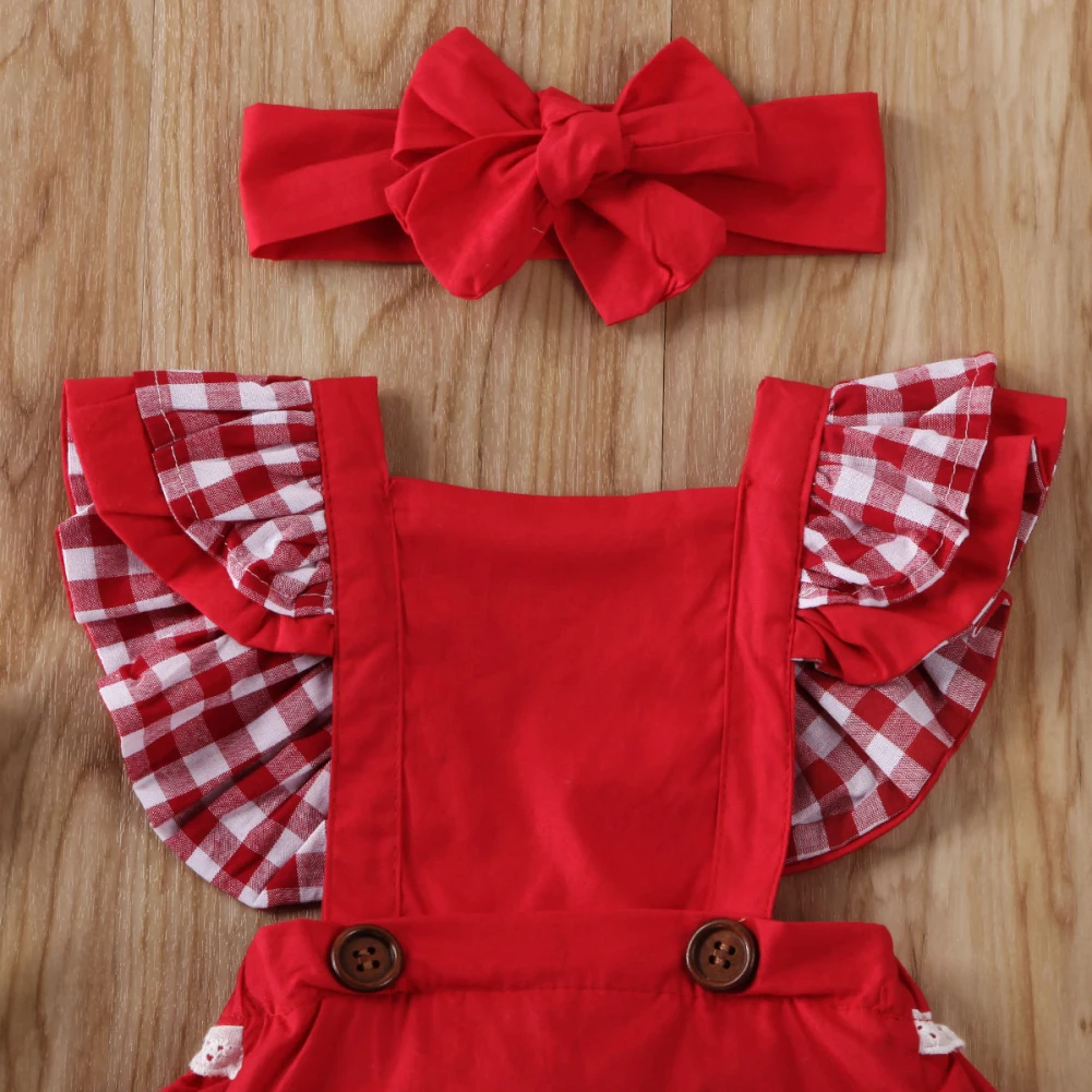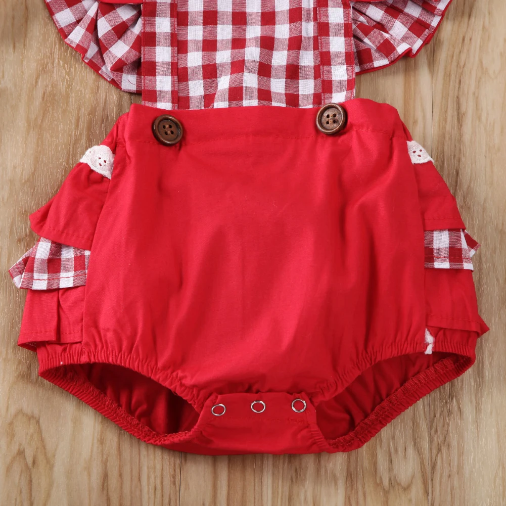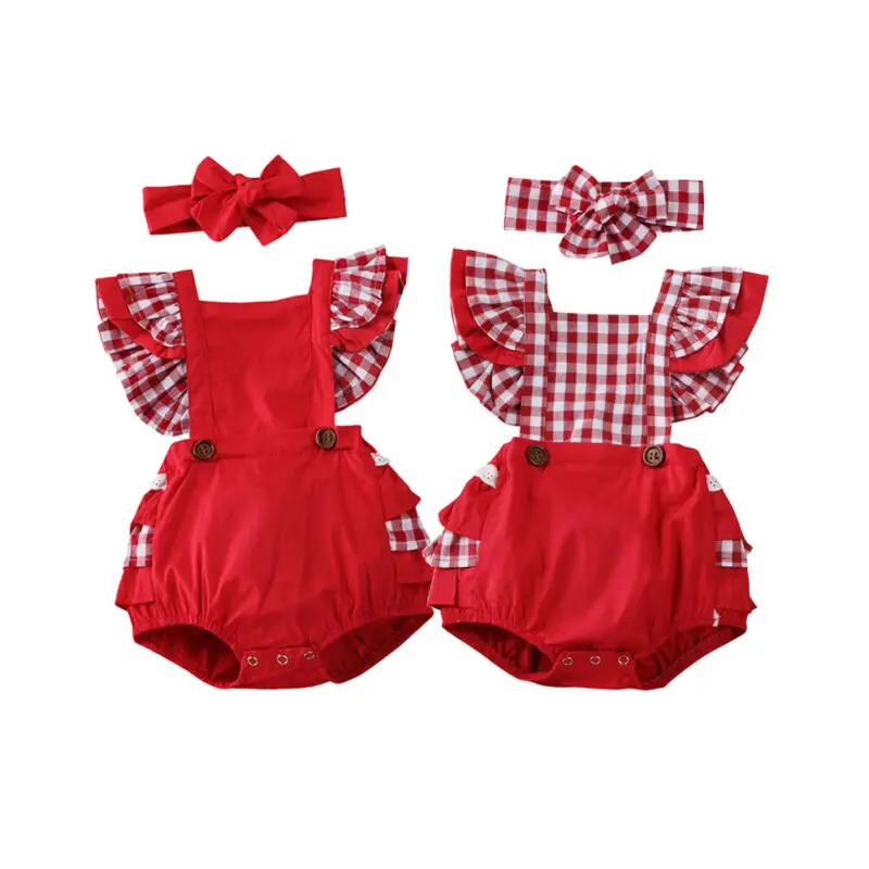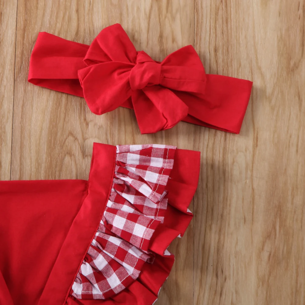 2 шт. для младенцев, для маленьких девочек Рождественский комбинезон и повязка на голову 2 шт. с низким вырезом на спине с оборками на рукавах, в клетку, с принтом Комбинезон, комбинезон, комплект одежды, летний пляжный костюм