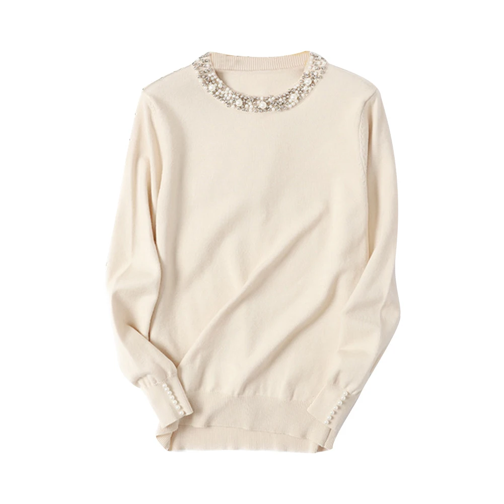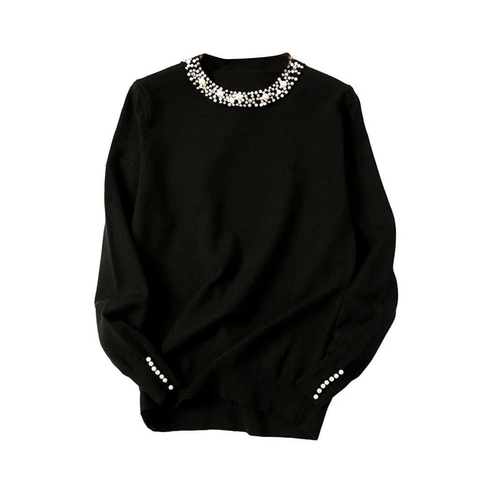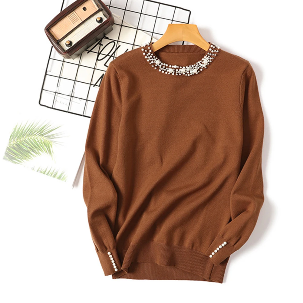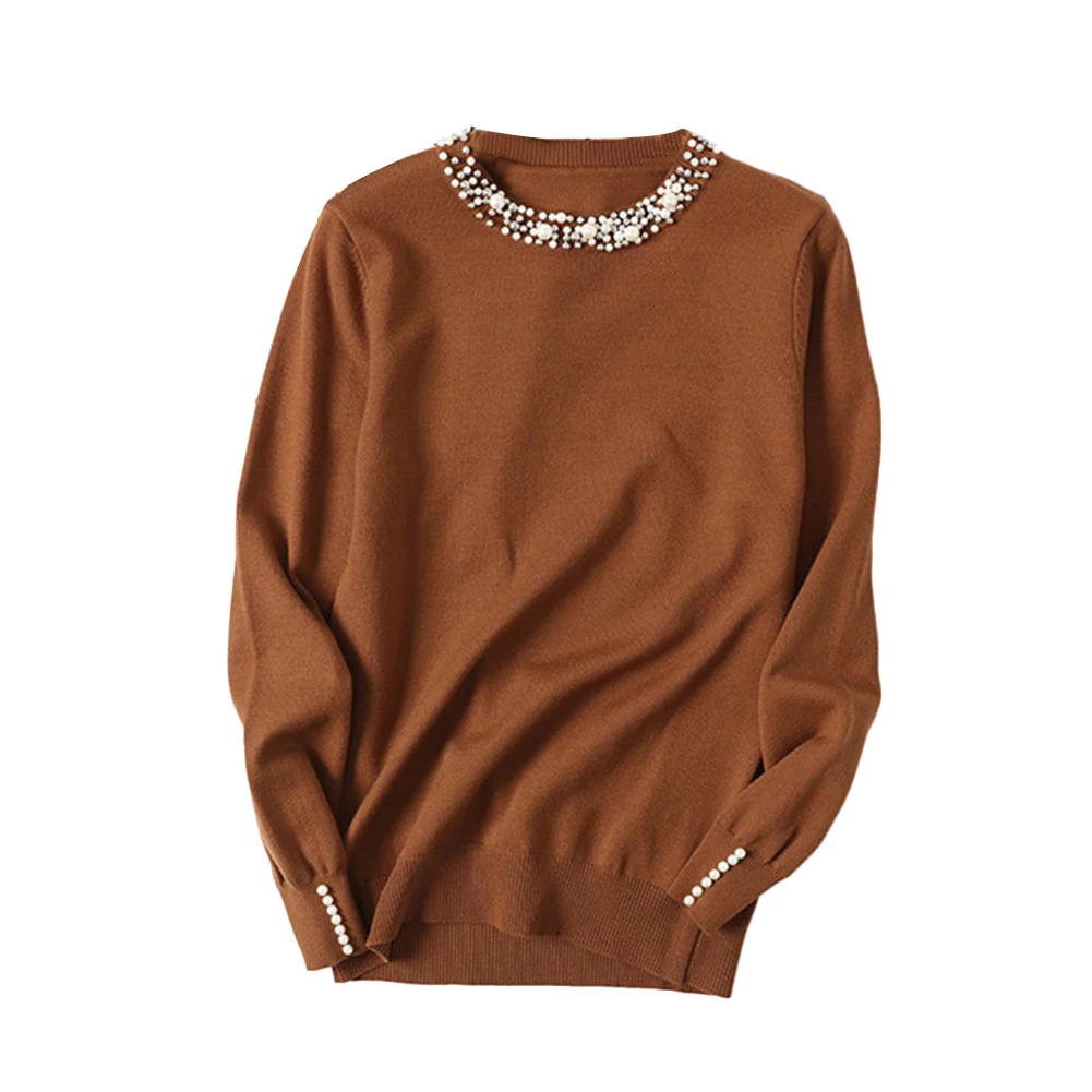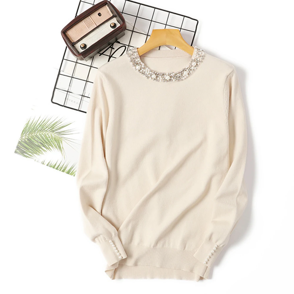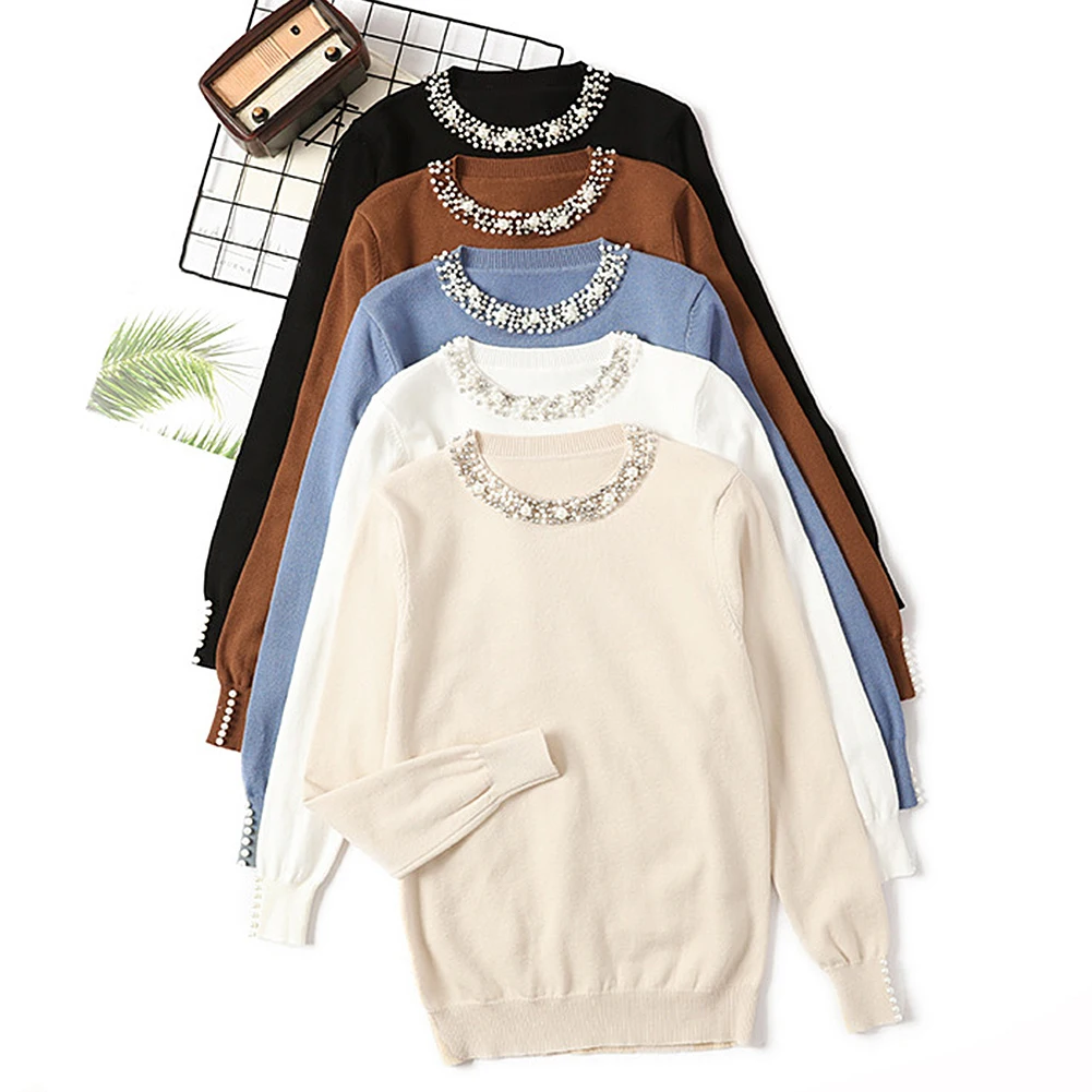 Женский свитер с бусинами, элегантный джемпер с круглым вырезом, Свободный Повседневный теплый свитер, трикотажная рубашка, Осень-зима 2019