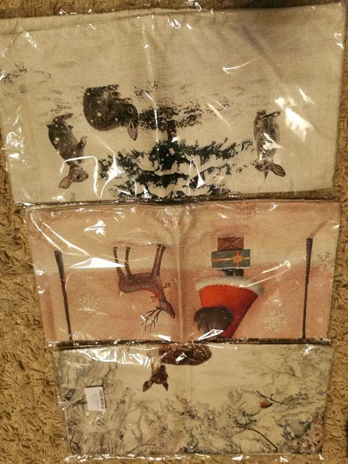 Милота! Очень симпатичные наволочки. Конечно это не лен и не хлопок, а синтетический материал, но смотрятся красиво, для нового года подойдет , создать атмосферу и настроение. Еще не стирала, как постираю дополню отзыв.