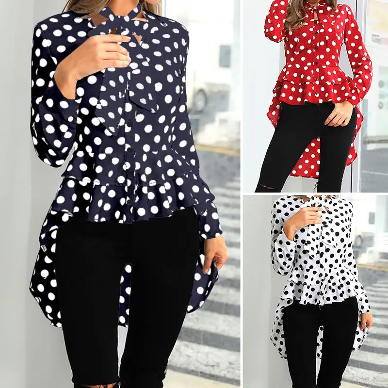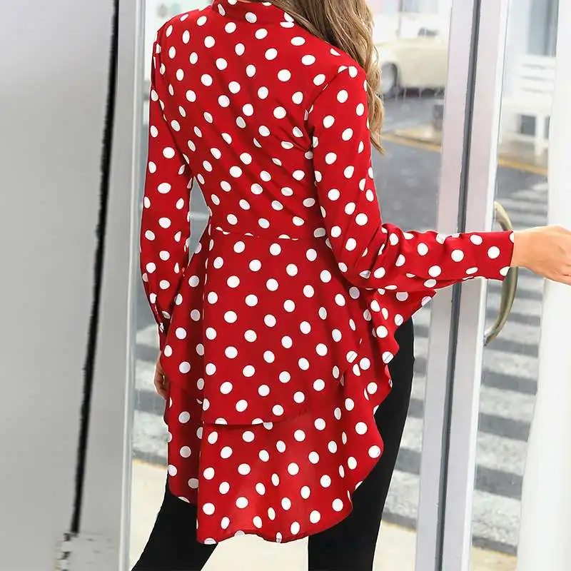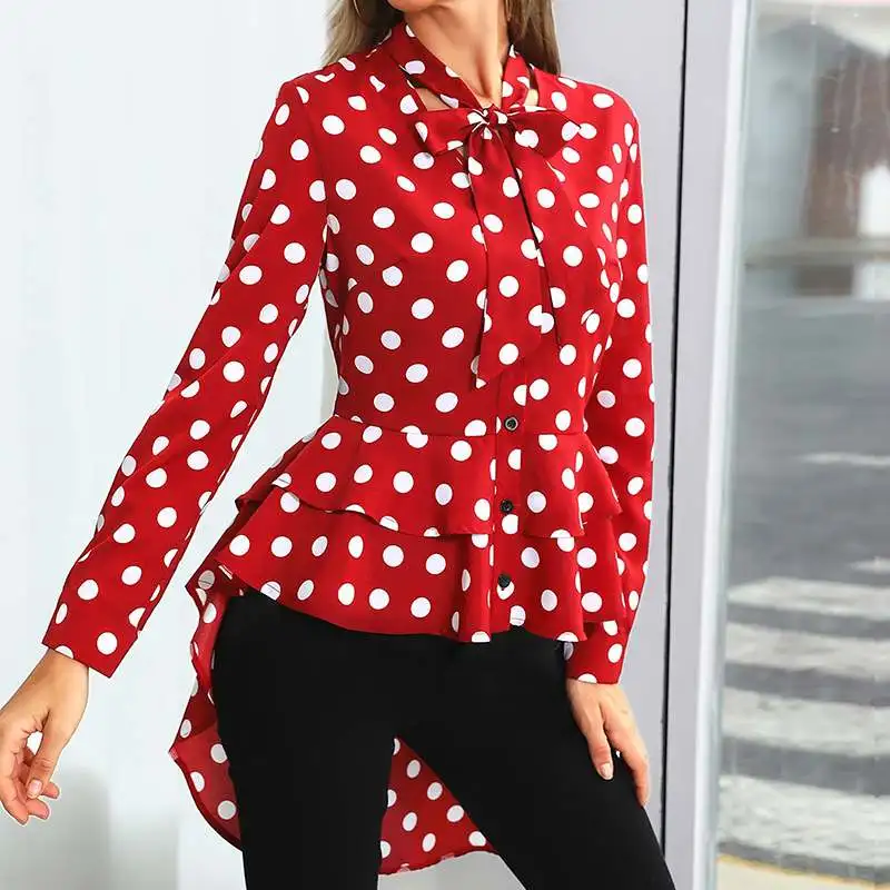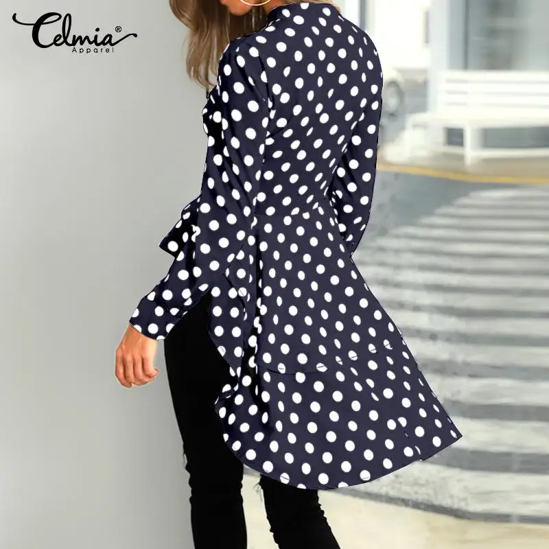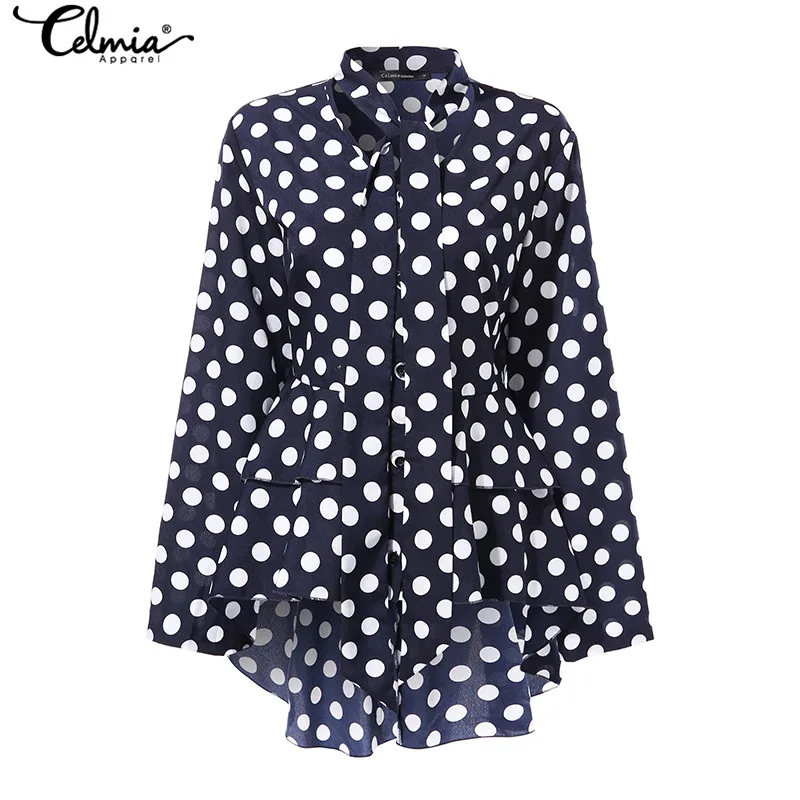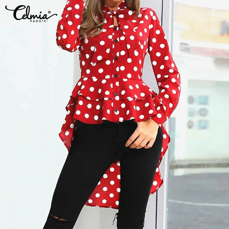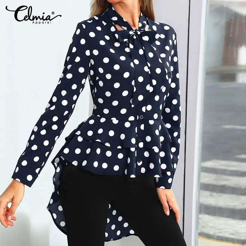 Блузка Celmia Женская ассиметричная с длинным рукавом, рубашка в горошек, с бантом на шее, Элегантная туника с оборками