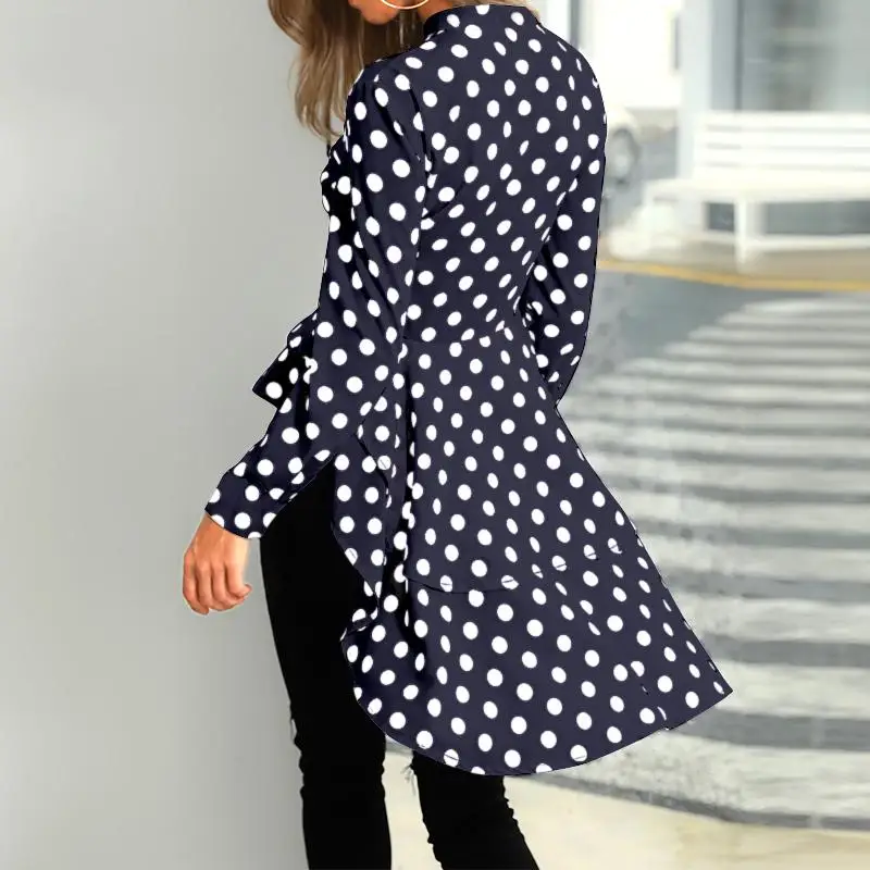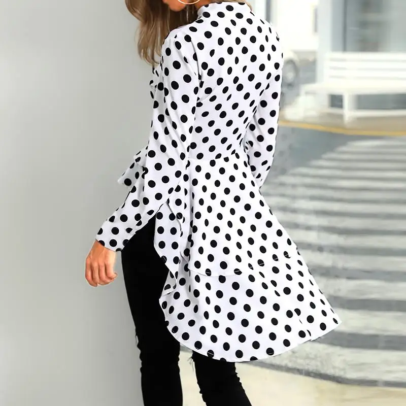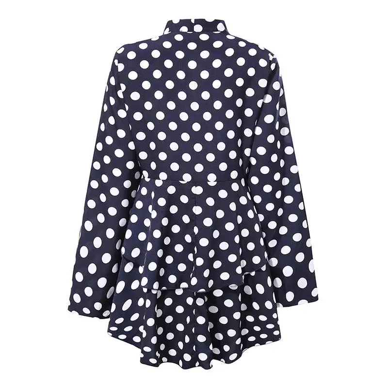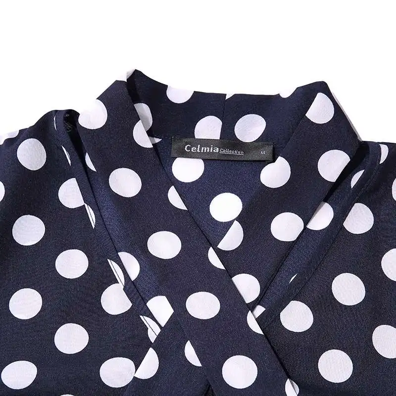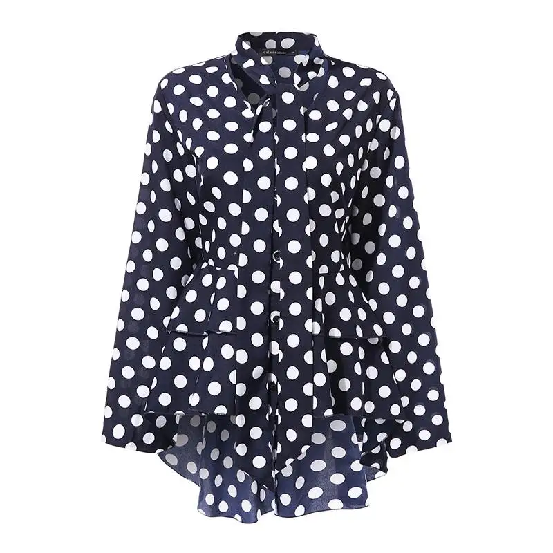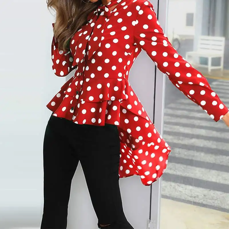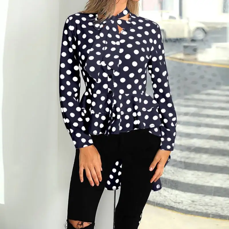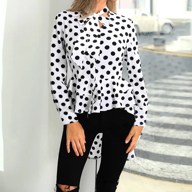 Блузка Celmia Женская ассиметричная с длинным рукавом, рубашка в горошек, с бантом на шее, Элегантная туника с оборками