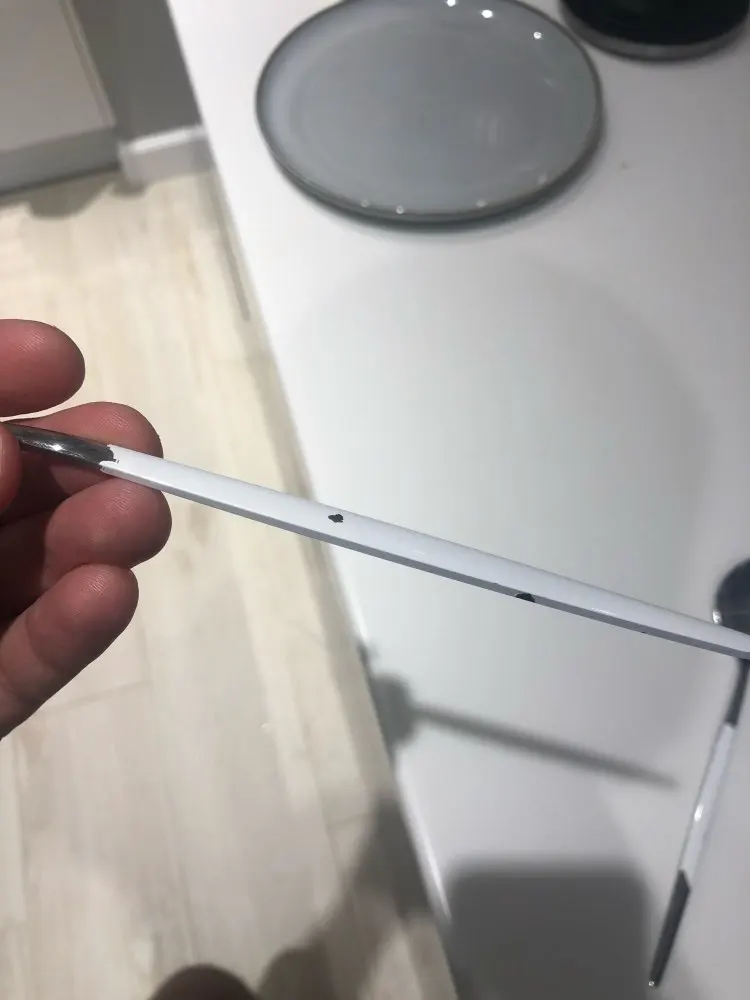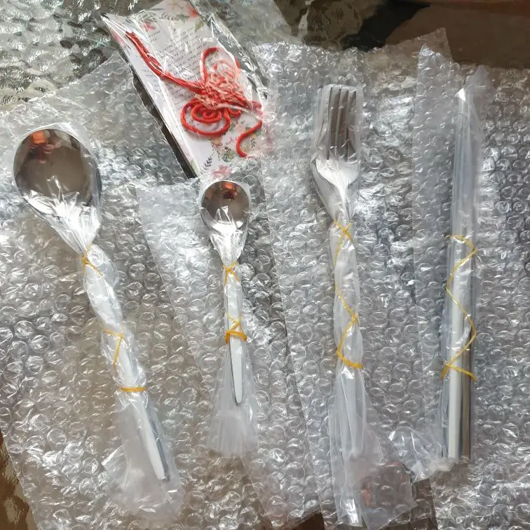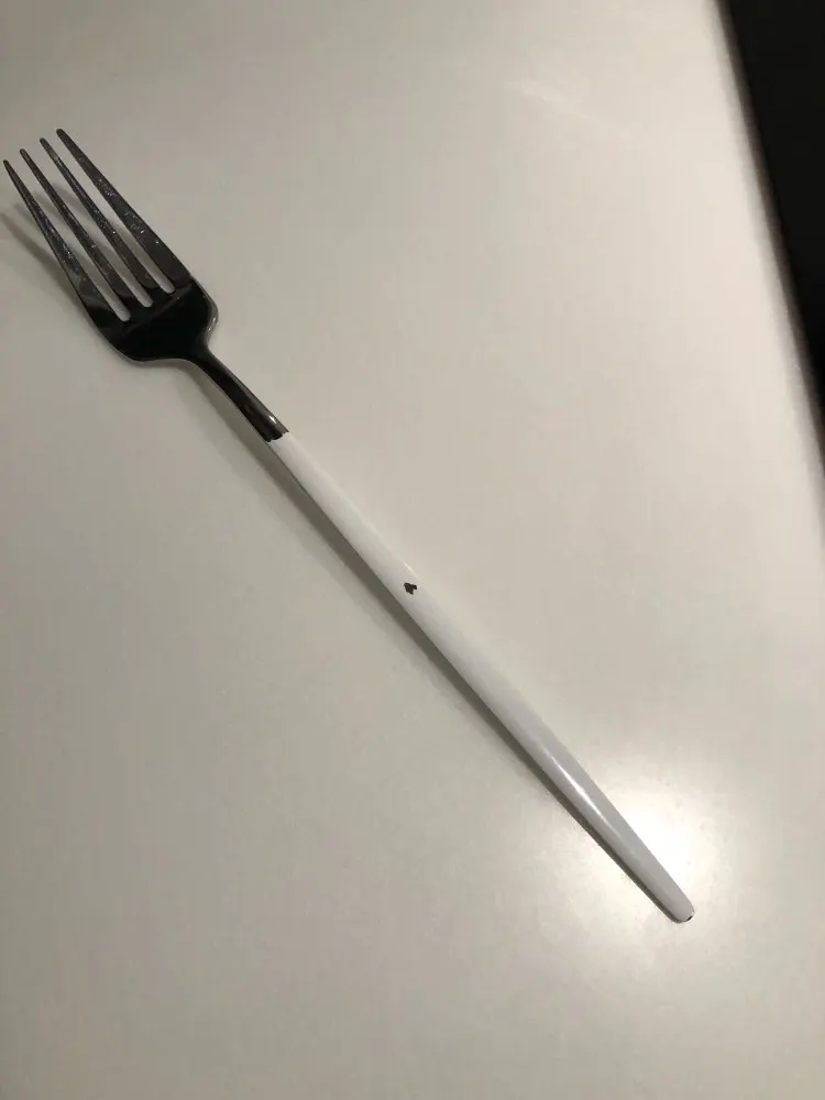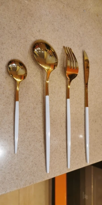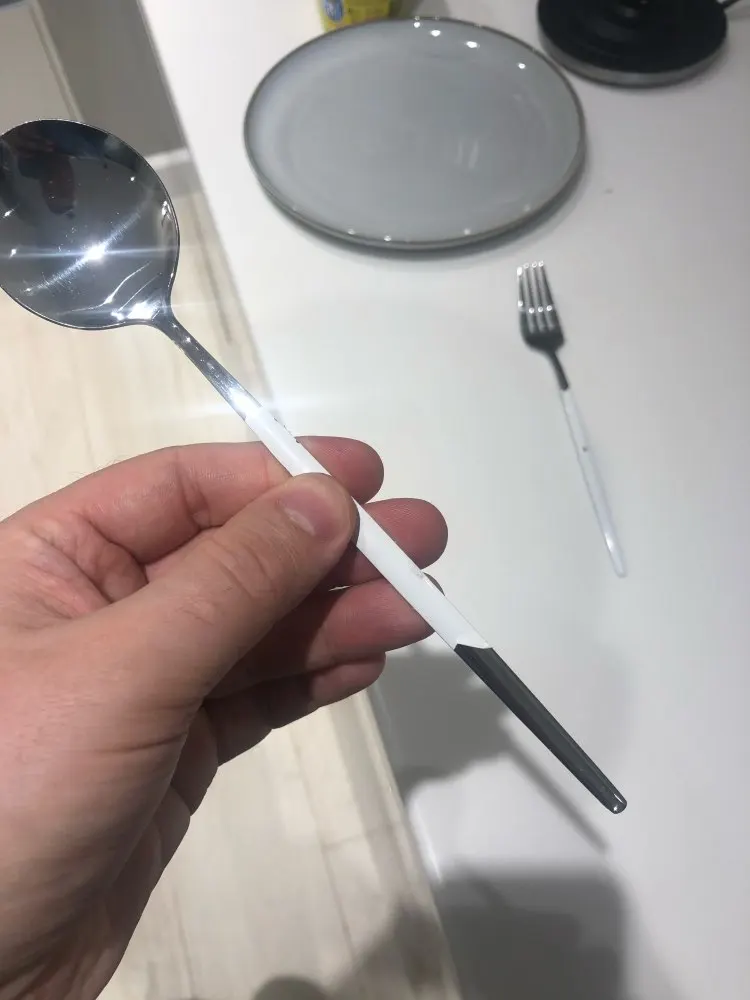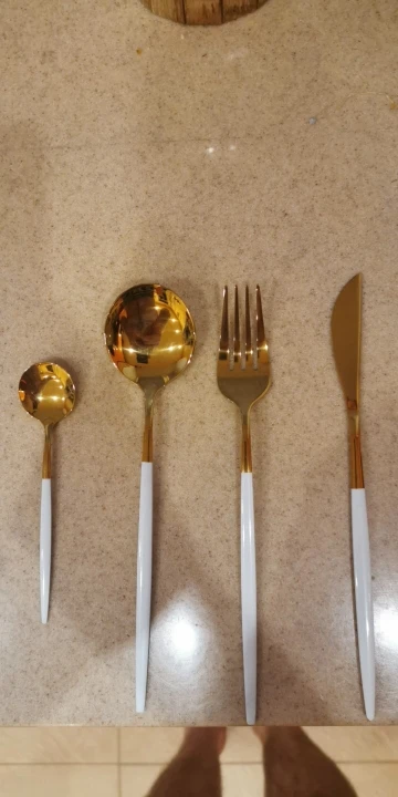 Набор смотришься очень красиво! Приборы сделаны из металла, поэтому не легкие, но в меру приятно лежат в руке. Белая окантовка это просто прокрашенный метал белой краской. Есть ими удобно и приятно)) одна ложка пришла с небольшим браком. Доставка была ну очень долго, заказывала на распродаже в ноябре, пришли в январе. Буду брать ещё для полного комплекта на 6 персон!