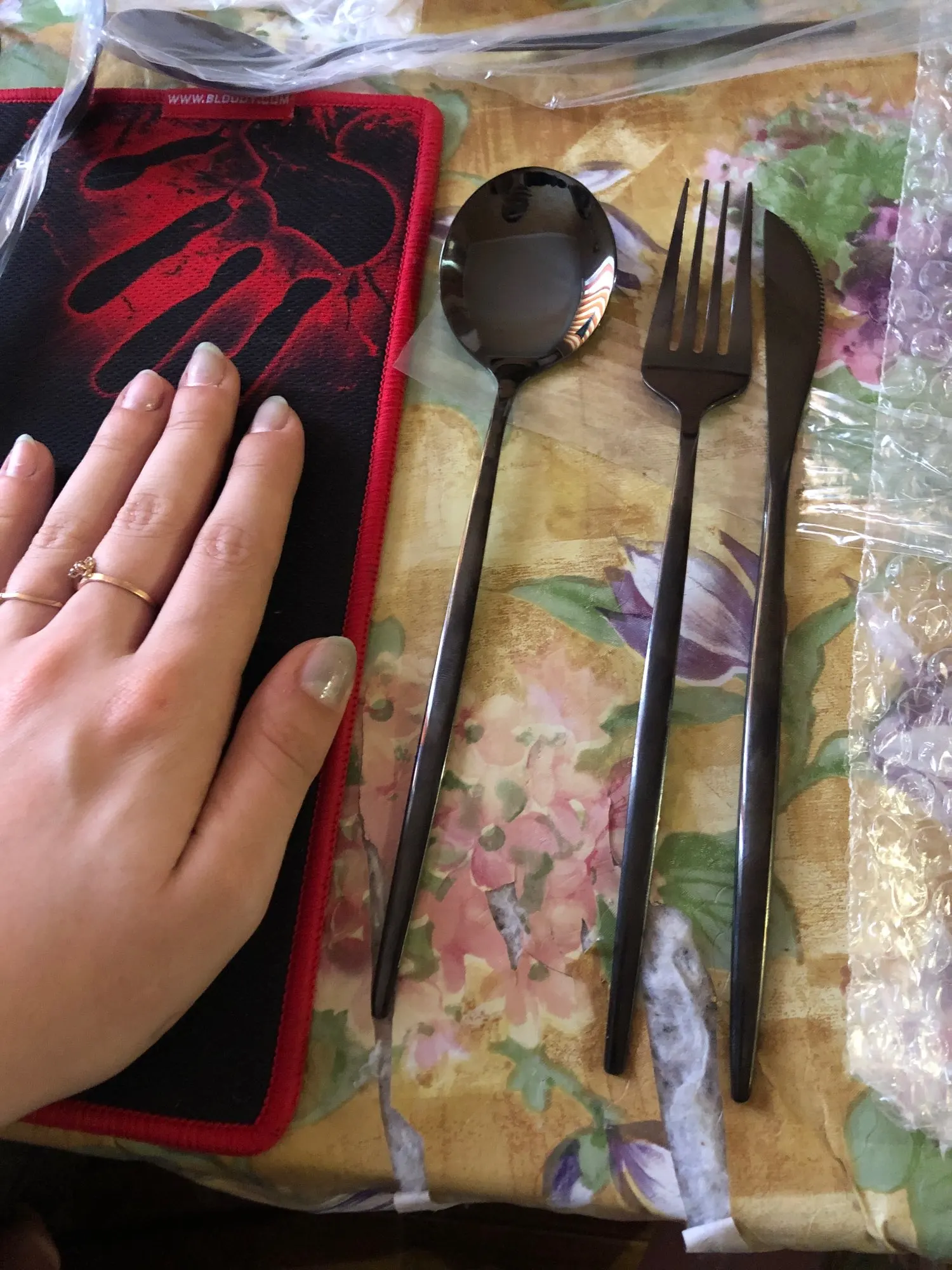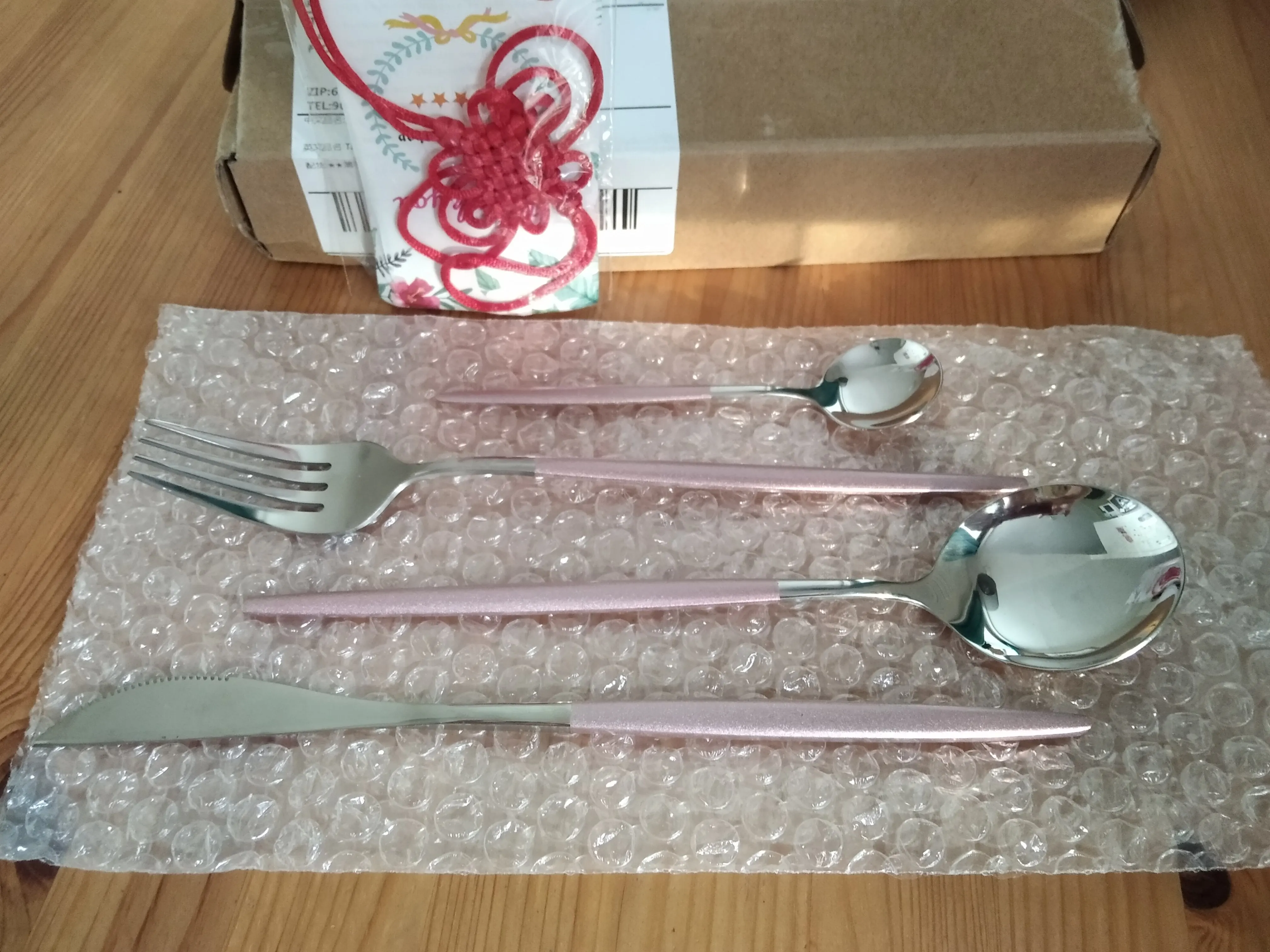 Я в восторге! Столовые приборы очень красивые и выглядят качественно! Шли до меня месяц. Привез курьер сдэком прям на дом. Каждый прибор был упакован в отдельный пакетик и в пупырчатую пленку. Очень красивые приборы! ( кстати, нож режет мясо). Розовое покрытие сделано качественно, без сколов и зазубрин. С продавцом не общалась. Товар однозначно рекомендую! Буду заказывать еще! Другие пишут в комментариях, что покрытие слезает у некоторых, я проверю по себе и дополню отзыв потом)