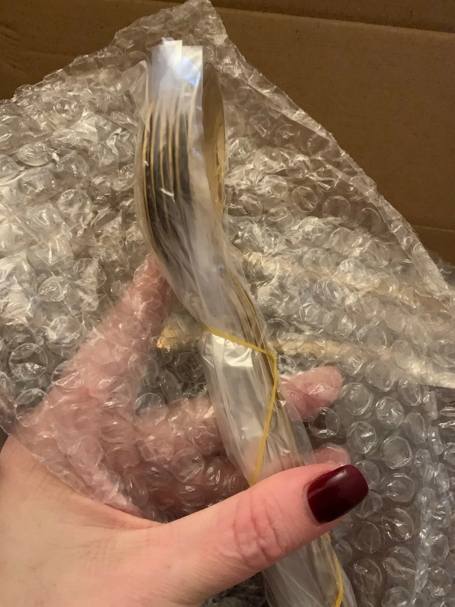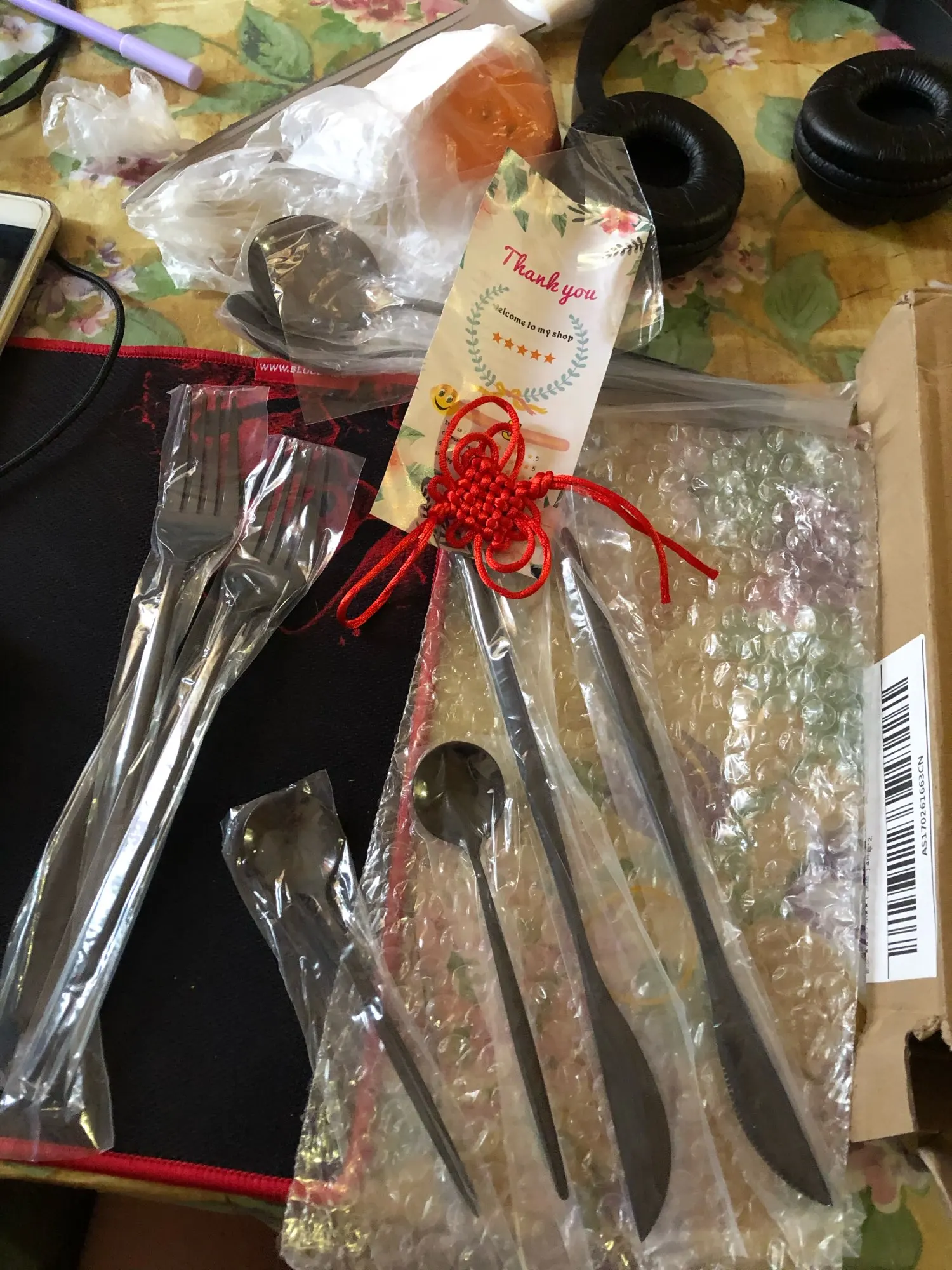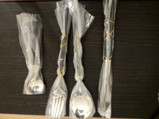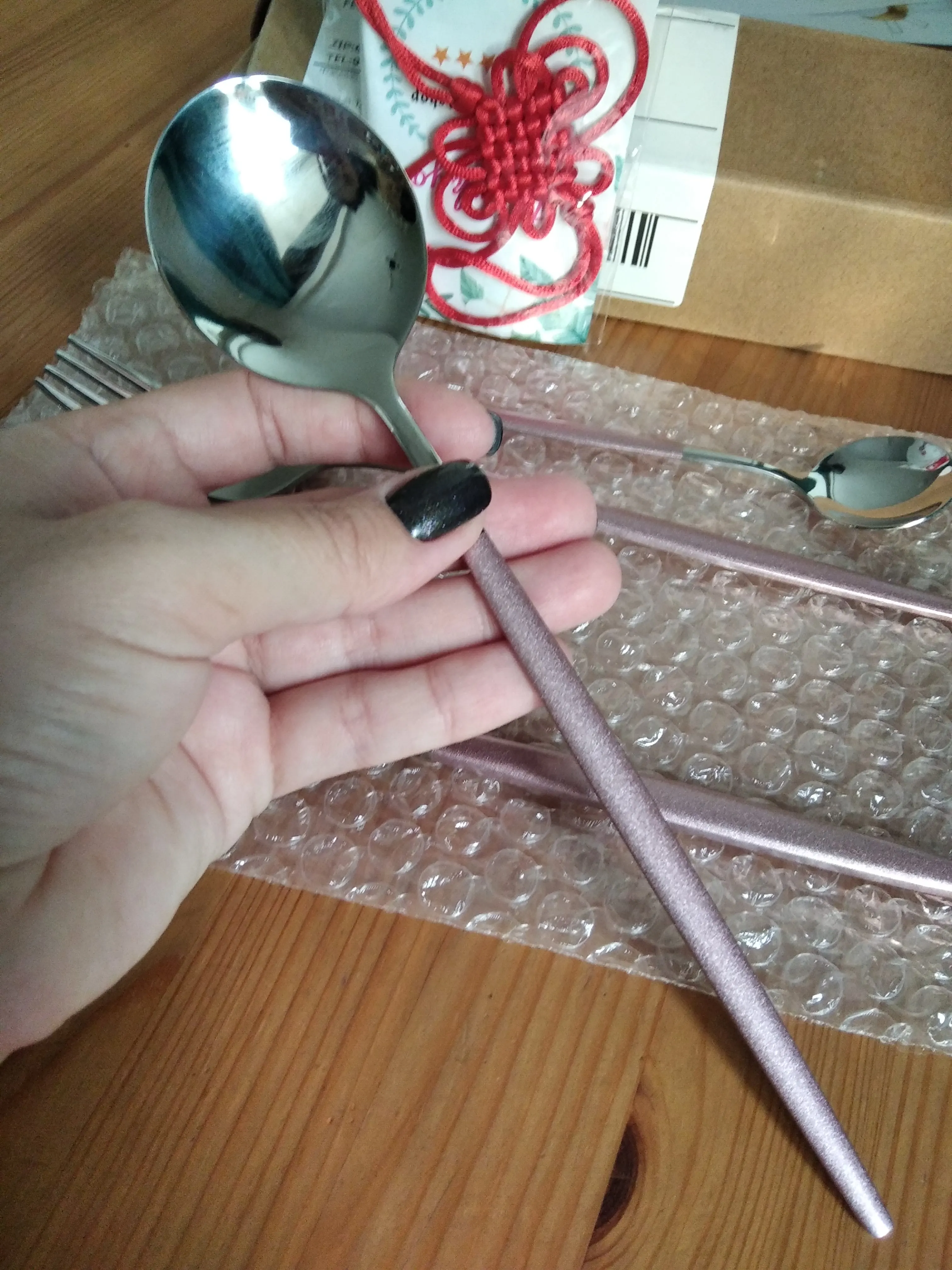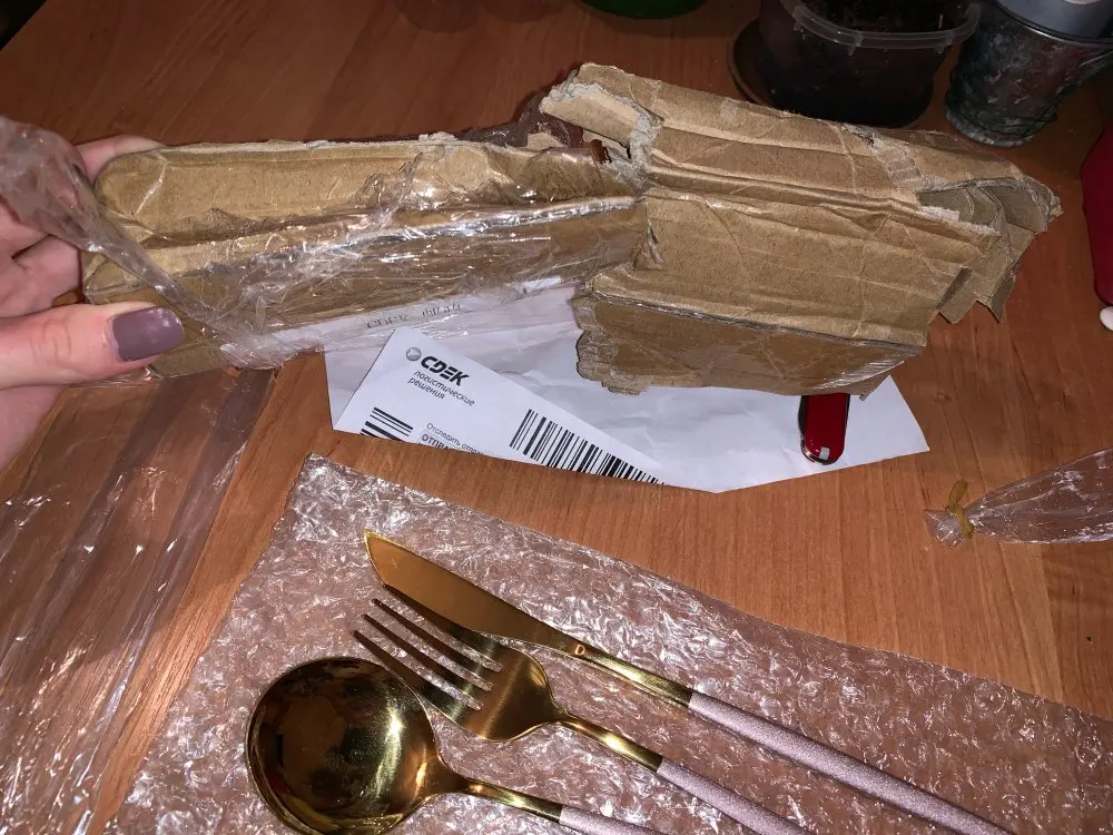 Посылка шла почти месяц до Красноярска. Доставил домой курьер СДЭКа. Вроде не плохие столовые приборы.