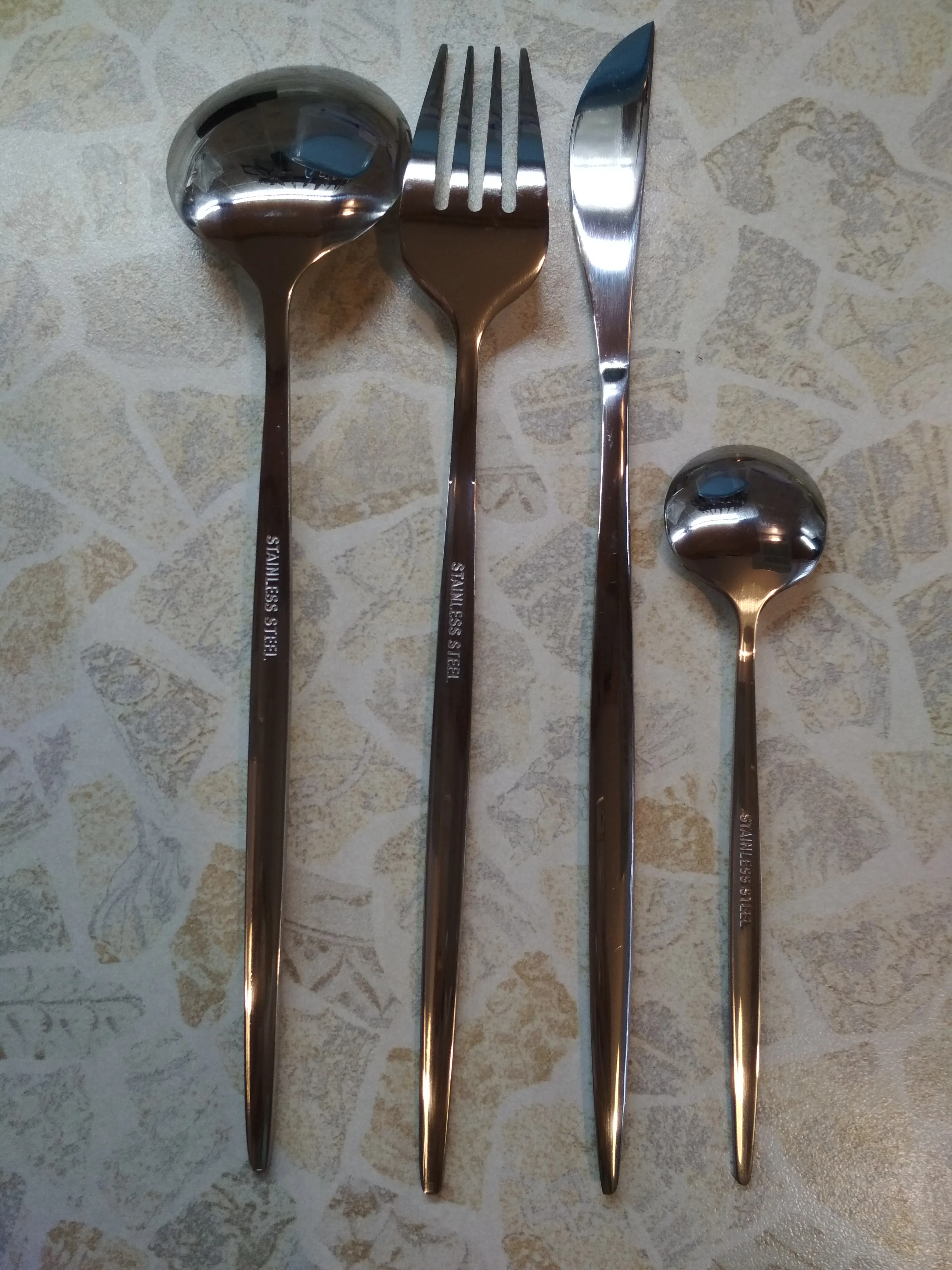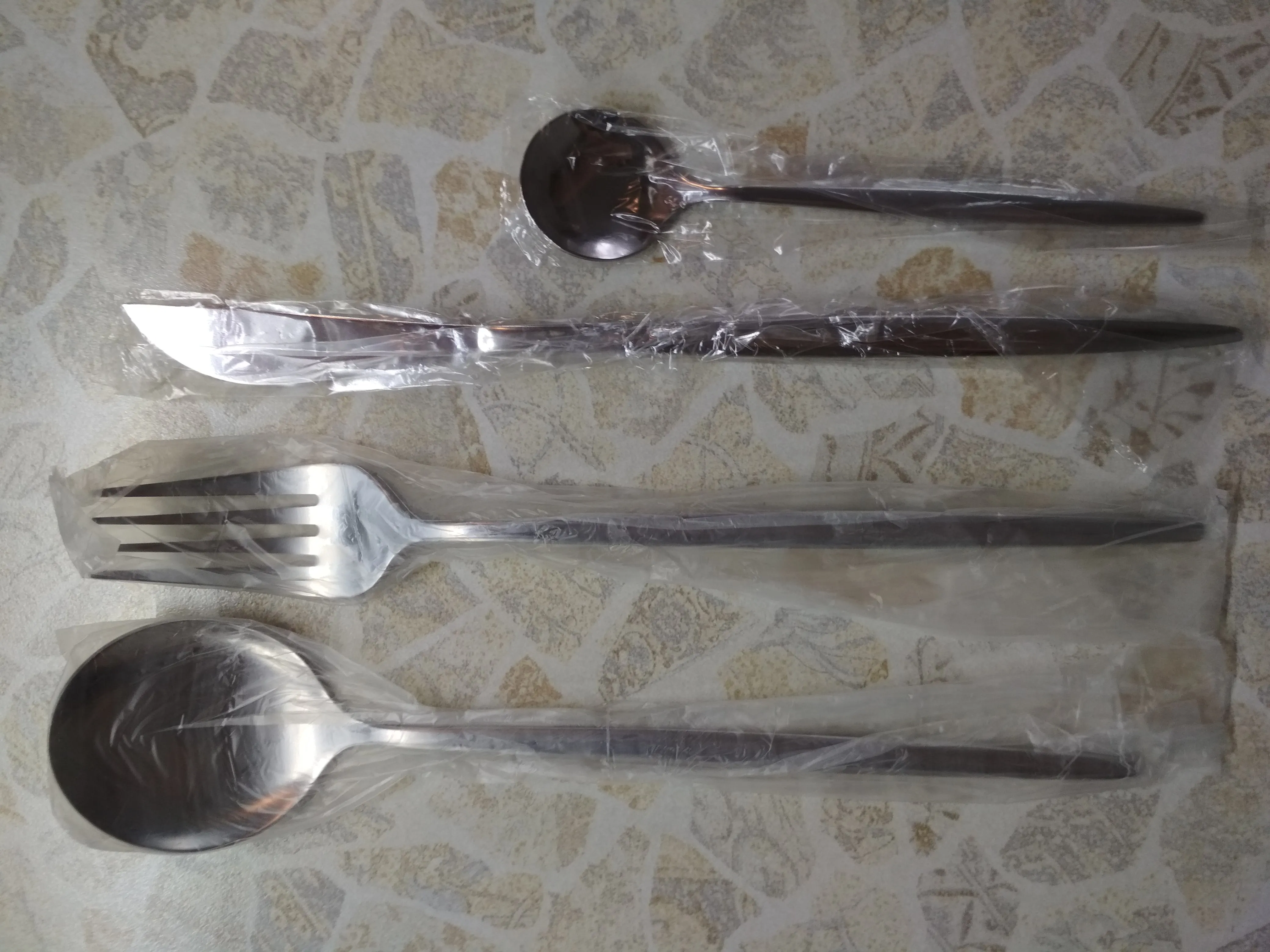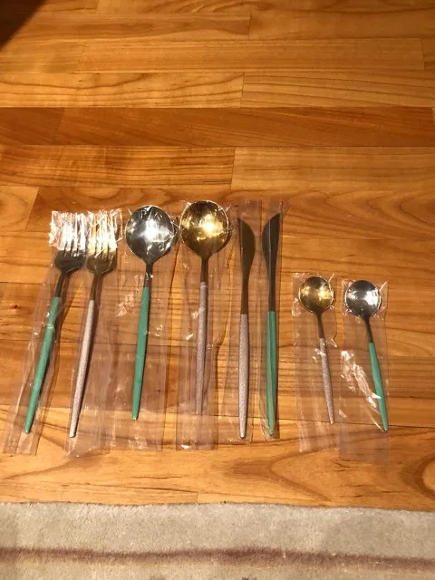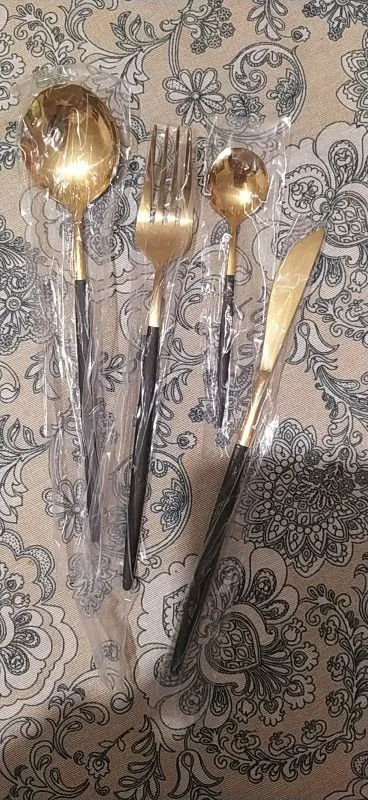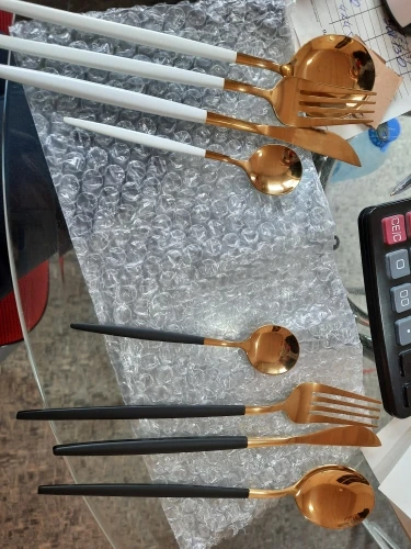 Стильные приборы, есть небольшие недостатки по металлу, но в общем за ту цену, сколько они стоят, это простительно. Меня немного смущала обратная сторона вилок и ложек на фото в отзывах (что они с небольшой вогнутостью), но зря переживала. Очень хорошо выглядят. Я бы не стала мыть в ПММ, боюсь напыление матовое тогда недолго прослужит. Доставка долгая - больше 2 месяцев до Новосибирска и трек не отслеживался.