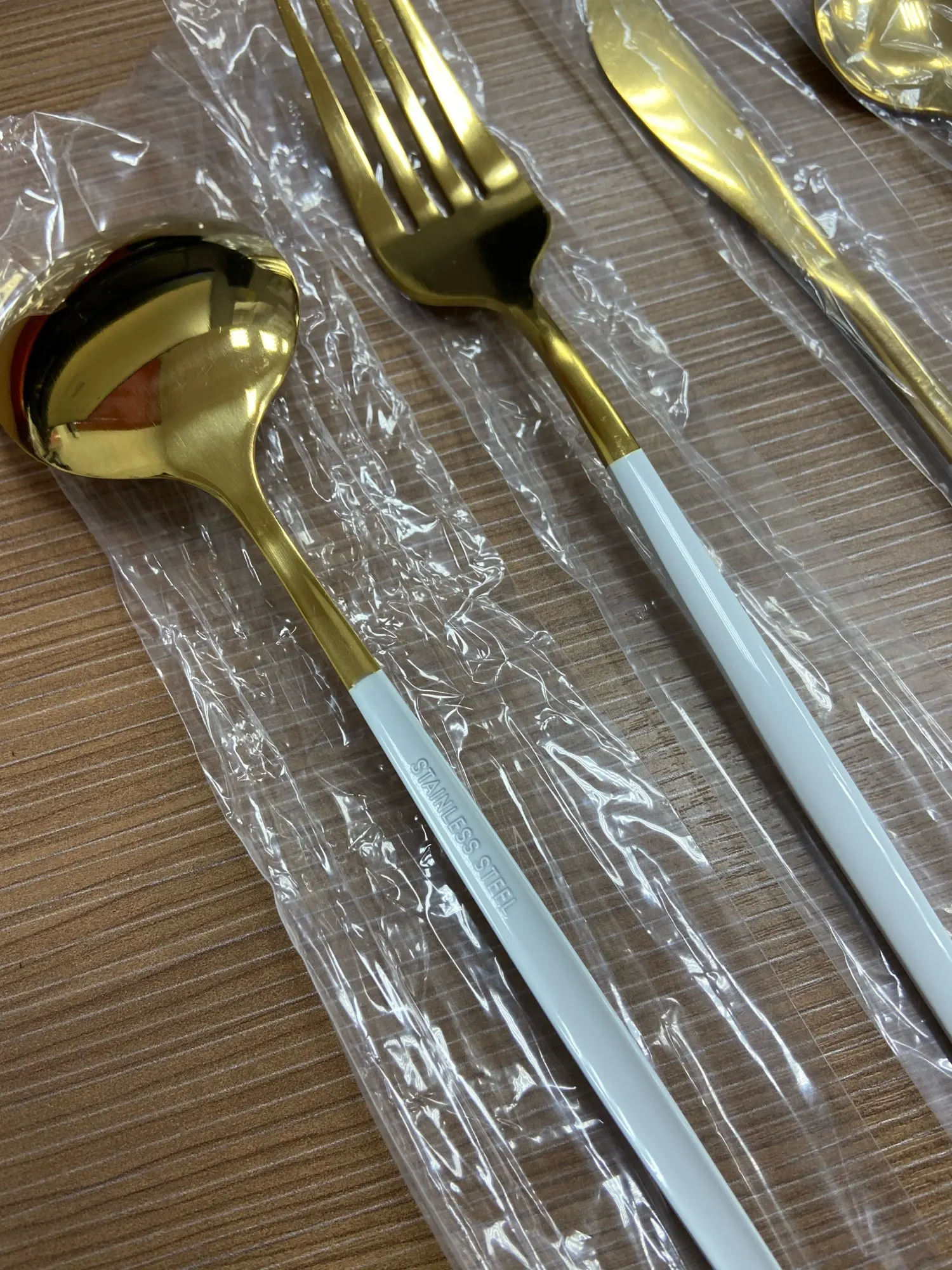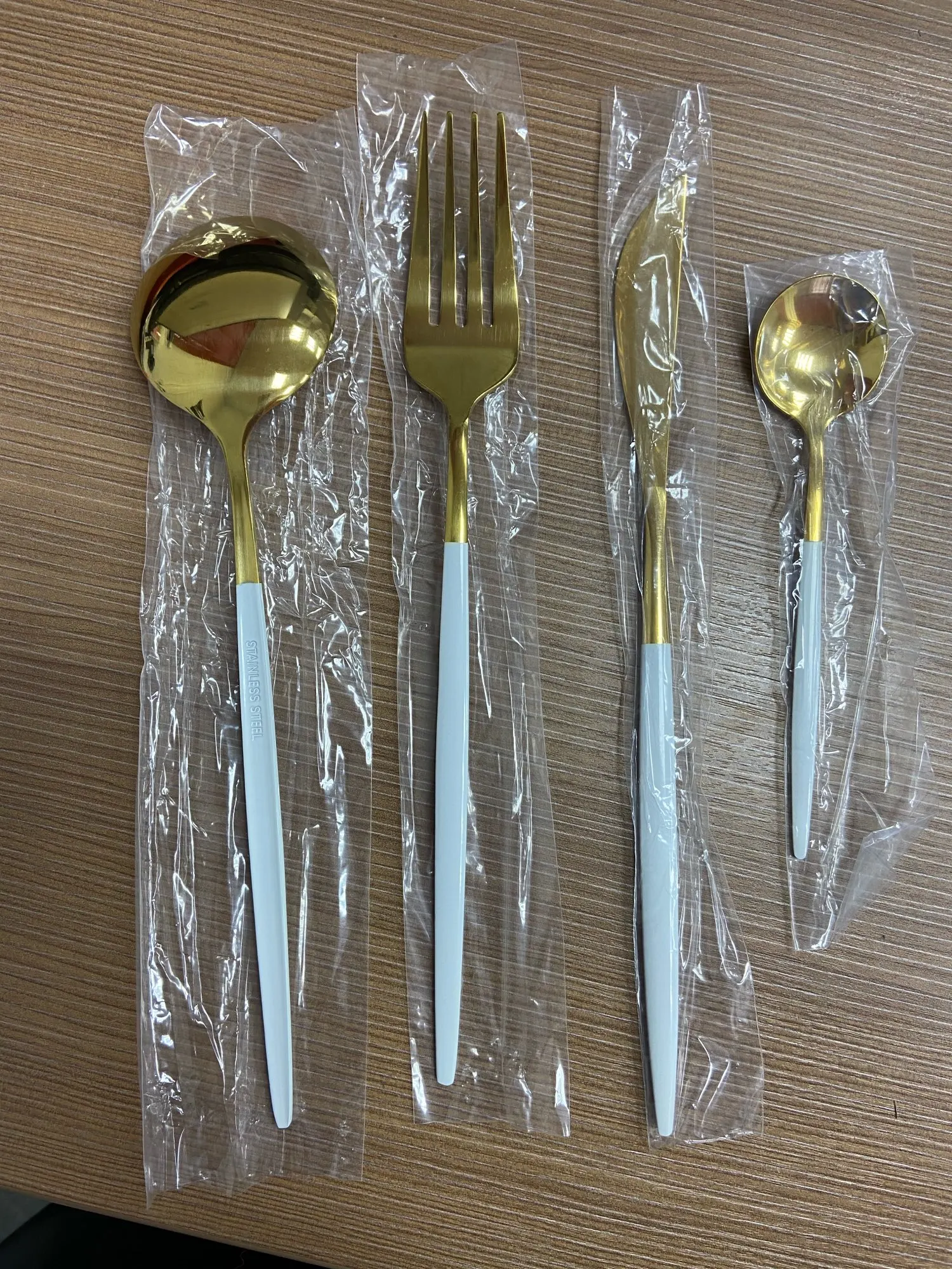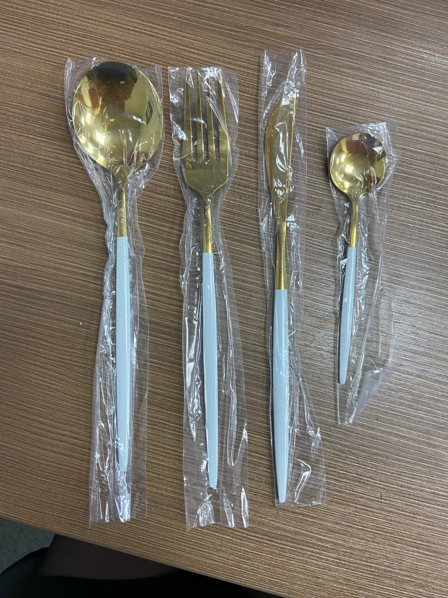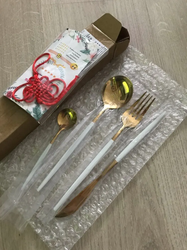 Приборы хорошие за такую стоимость. Материал - нержавеющая сталь. Доставка заняла чуть больше месяца. Посылка шла через Казахстан, долгое время не отслеживалась, но в итоге доставили на дом через курьера СДЭК, что для меня очень удобно, ведь на Почту идти не надо. Качество не совсем восторг, ножом и ложкой я не смогла бы пользоваться в повседневной жизни, но я и заказывала эти приборы для фотографий, поэтому мне нормально. На золотом ноже небольшие потертости, поэтому как подарок или на продажу может не подойти. В целом, я довольна, продавец отвечал быстро, отправил посылку тоже сразу.
