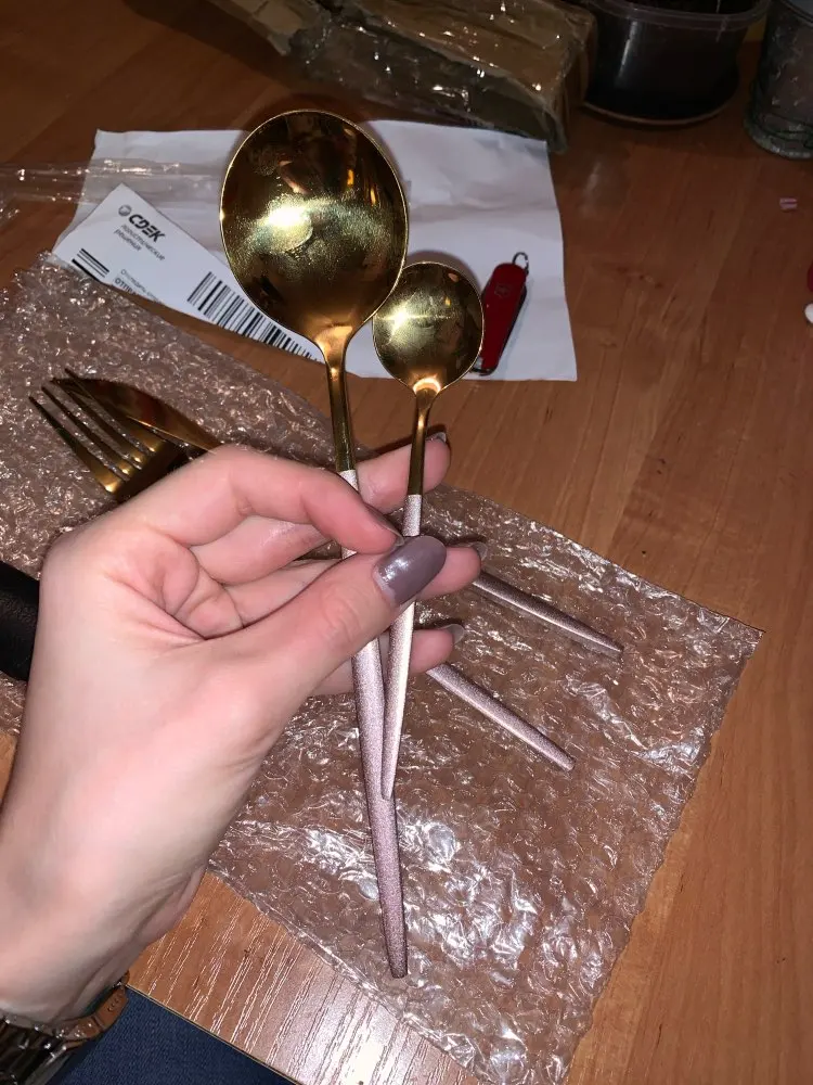 Очень симпатичные столовые приборы, принесли СДЭК на дом. Один небольшой минус-ложки неглубокие от слова "совсем", суп есть не очень удобно, но в целом очень довольна заказом.