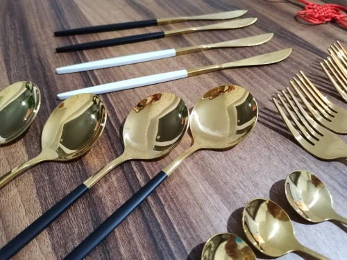 отличные приборы!заказала сначала 4 комплекта и как получила ещё 2.прошло уже пара месяцев как пользуемся-в посудомойке на отлично,не облазят,так же ярко золотые и очень приятные в использовании!ручки матовые и как будто чуть прорезинены-поверхность надежная)когда таким ножичком что то режешь в тарелке чувствуешь себя хирургом))ещё положили во второй заказ подарочек,мелочь а приятно!единственный минус-ну очень долго шли...два месяца если не дольше