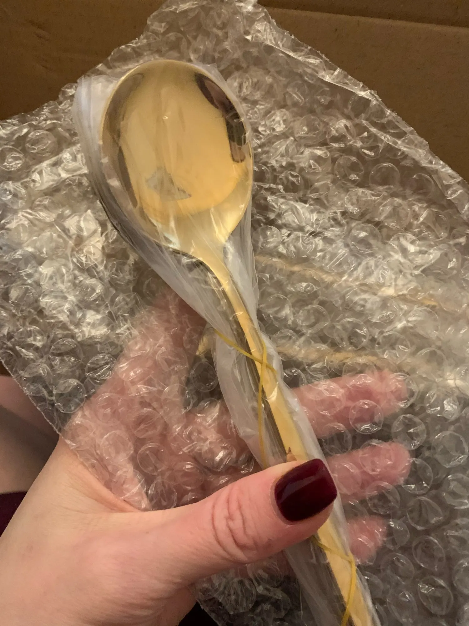 заказом очень довольна! доставили домой, через СДЭК. качество хорошее, тяжёлые, обточены хорошо. заказывала полный комплект четвёрку. все 4 предмета хорошие и приятные. со временем посмотрим, потеряют ли золотой цвет. в посылку положили маленький подарочек. пока твёрдая 5!