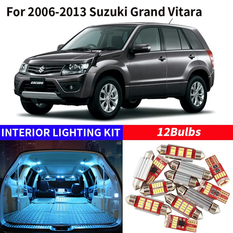 12x белый авто светодиодный светильник, лампы для интерьера, набор для 2006-2013 Suzuki Grand Vitara 12V светодиодный, карта, купол, номерной знак, лампа для стайлинга автомобиля