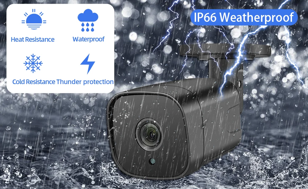 Используйте их как наружные или внутренние камеры, так как они крепко выдерживают любую погоду: дождь, снег, пыль и жаркие дни. Благодаря классу защиты от атмосферных воздействий IP66 и кабелям, продетым через подставку для обеспечения дополнительной защиты, вы сможете ответить на их работоспособность, день за днем. В нашей камере используется сверхпрочный металлический корпус, профессиональный водонепроницаемый IP66, обеспечивающий стабильную производительность как в помещении, так и на улице.