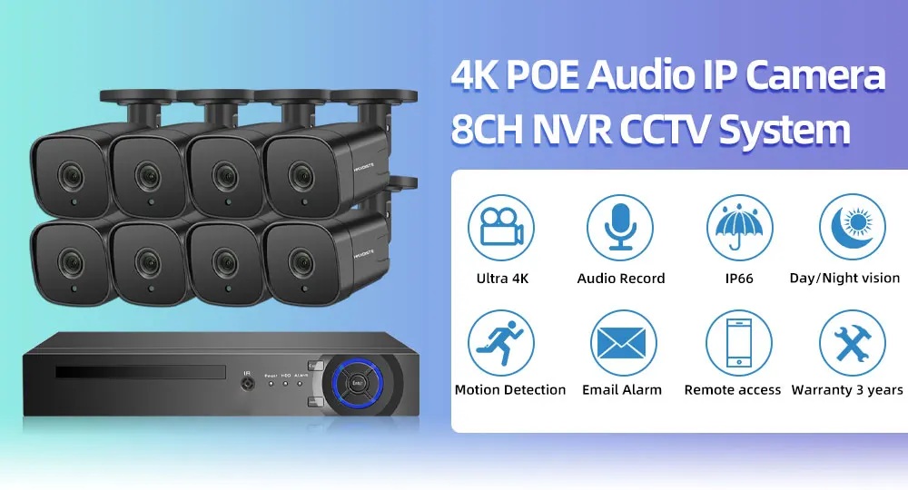 1. Все наши сетевые видеорегистраторы являются реальными H.265 4K 8MP, сетевой видеорегистратор может поддерживать 8MP и 4K max, вы можете подключить 720p,1080p,3mp,4mp ,5mp, камеры 8 МП и 4k с нашим видеорегистратором POE;2. Наш сетевой видеорегистратор и камеры поддерживают расширенное Сжатие видео H.265, питание через Ethernet,Plug and play, простота в использовании;3. Все камеры оснащены встроенным микрофоном, поддерживающим запись звука и дневное ночное видение Ultra HD;4. Все камеры изготовлены из металлического материала, IP66 водонепроницаемы, подходят для внутреннего и наружного применения, надежная безопасность дома;5. Поддержка обнаружения движения, оповещения по электронной почте, воспроизведения видео и нескольких языков;6. Поддержка Android,Iphone,Ipad, ПК, VMS,P2P view;7. Удаленный доступ в любом месте и в любое время;8. Подходит для всех видов приложений;