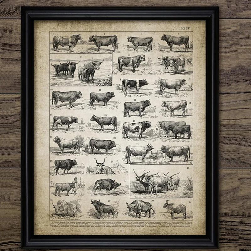 Античный бык породы принт крупного рогатого скота ранчо арт Винтаж плакат корова породы сельское хозяйство Wall Art Холст Картина без рамки домашний декор