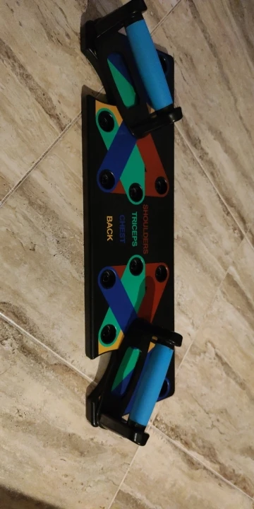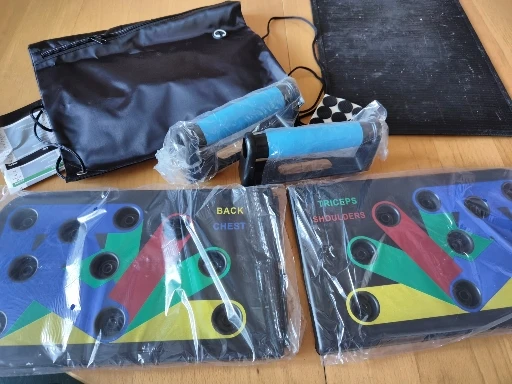 Міцна пластмаса. Мої 105 кг витримує без скрипу і люфтів. До позицій віджимань треба звикати, так само, як і до ручок. Але виглядає все якісно. І сумочка, навіть, з отвором під навушники.)