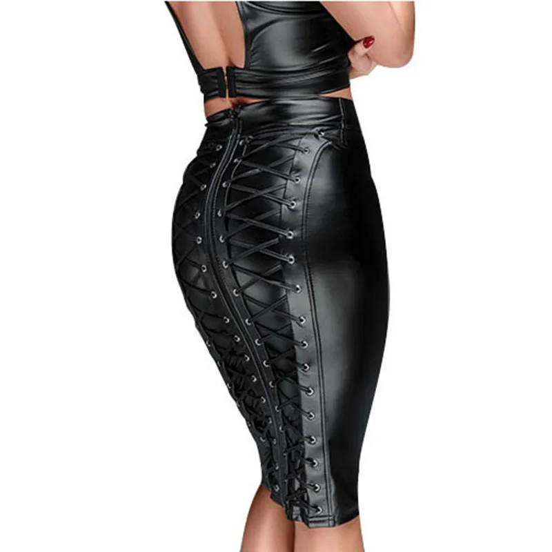Женская юбка из искусственной кожи, черная обтягивающая юбка до колен, с мокрым эффектом, на шнуровке сзади, на молнии, 2021