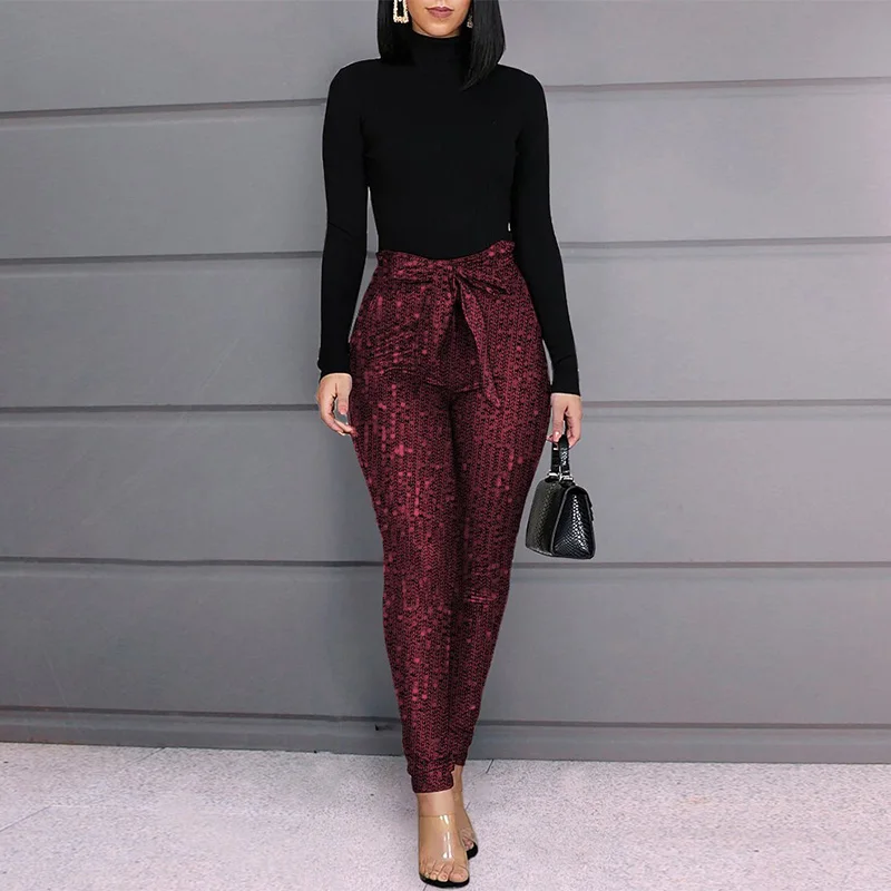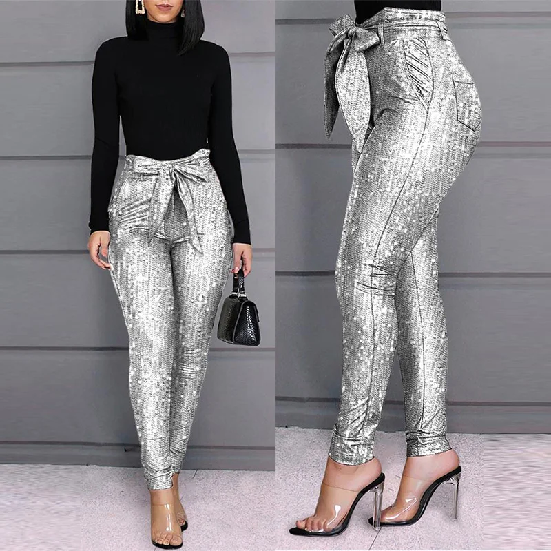 Блестящие узкие брюки с блестками и поясом, женские узкие брюки с бантом и высокой талией, дизайнерские узкие брюки с карманами, вечерние Клубные брюки