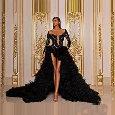 Роскошные черные платья для выпускного из иллюзии с бисером многоярусные тюлевые с высоким разрезом спереди длинными рукавами трапециевидные индивидуальные Формальные платья