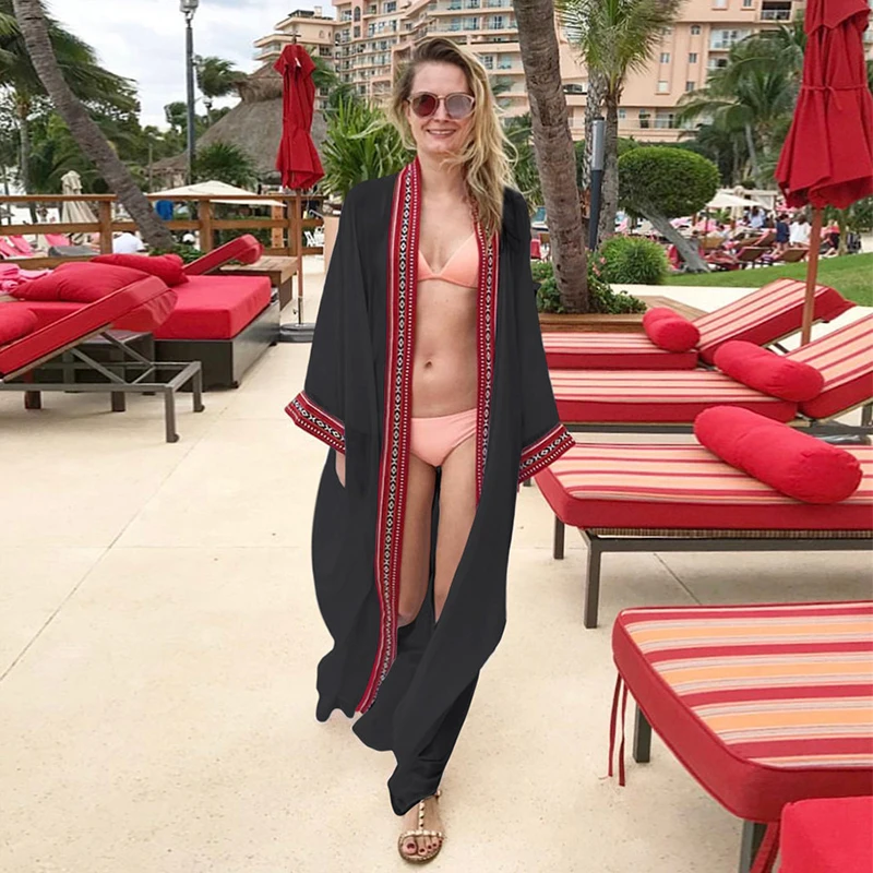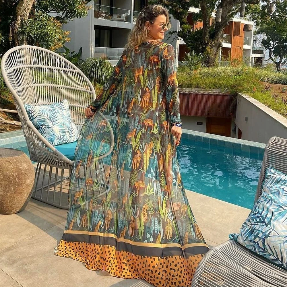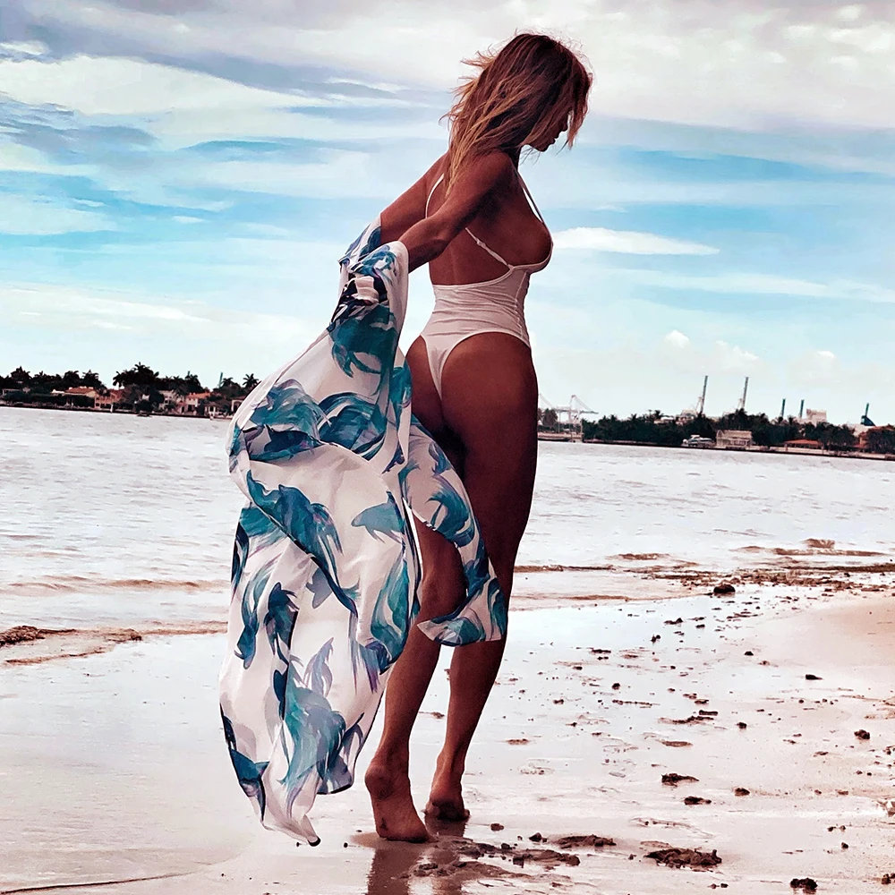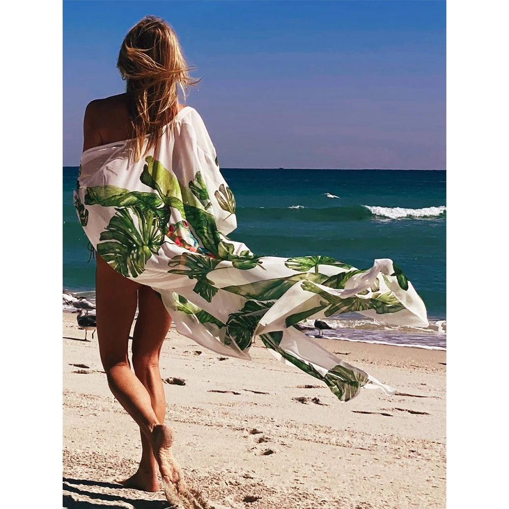 Пляжная накидка для бикини с принтом листьев, туники для пляжа, длинный кафтан, бикини, накидка, пляжный саронг, пляжный купальник, накидки