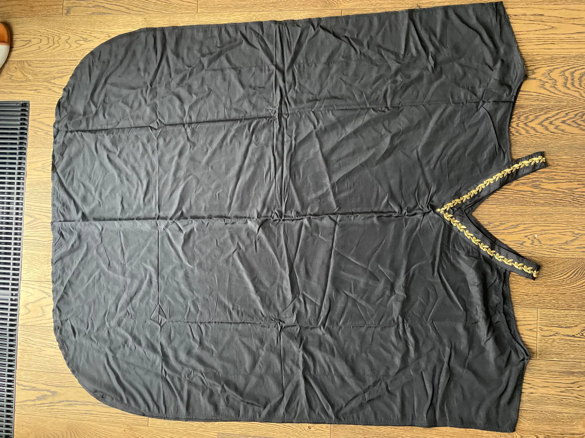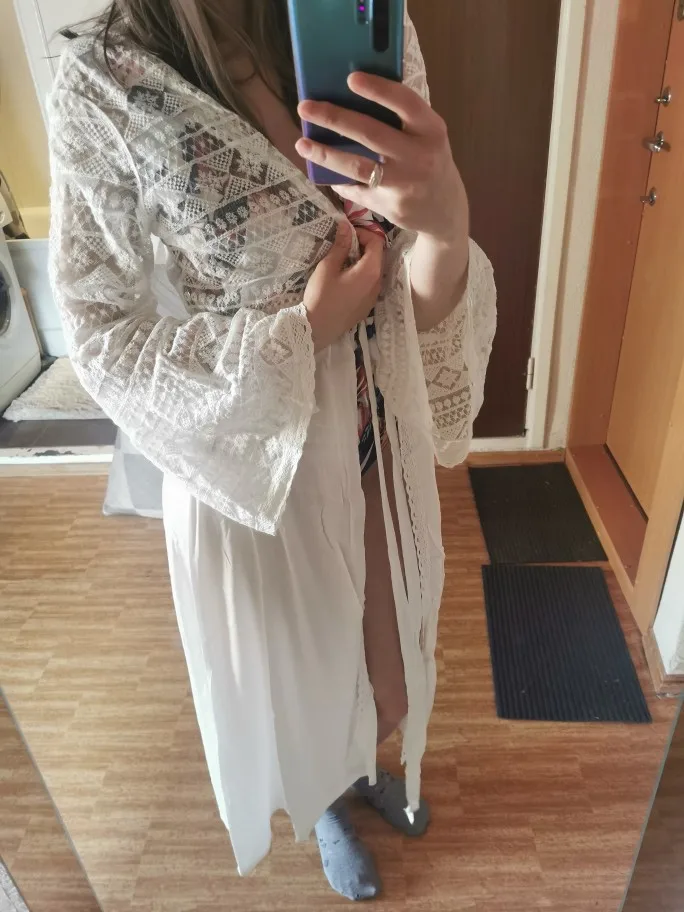 Накидка пришла очень быстро. менее 2 недель с момента заказа. Соответствует фото, материал не синтетика, типа "жатки". на рост 175см практически по щиколотку. на российский 44р подошла идеально. думаю, на 46 ещё подойдёт, на 48 будет мала.