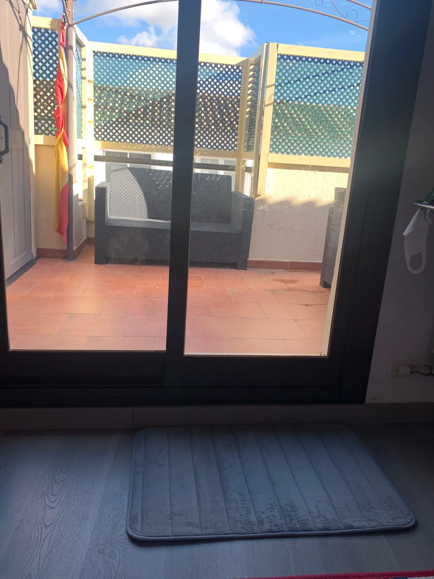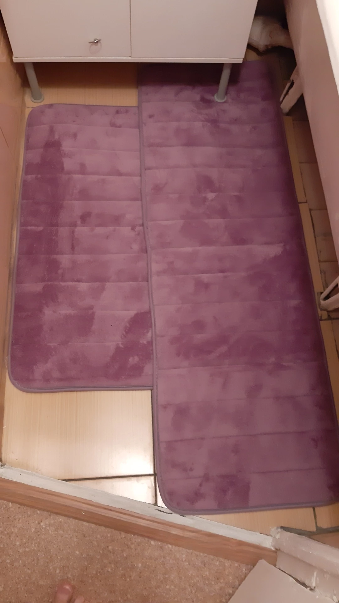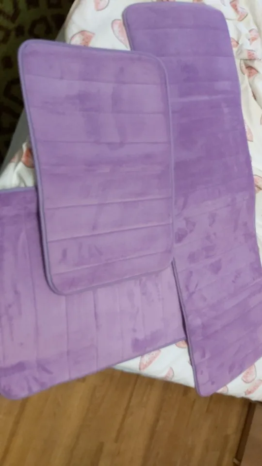 коврики шли 21день. качество и цвет друг от друга отличаются. длинный- качествнннее, шитье ровнее и на оборотной стороне есть прорезинивание. в двух других нету. но все же лучше, чем голая плитка...