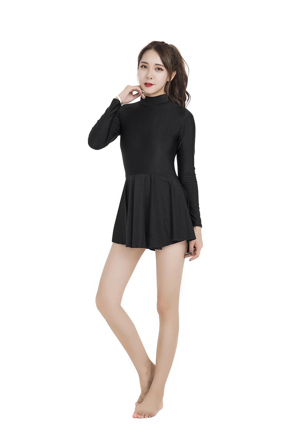 Женское балетное танцевальное трико с юбкой, цельное черное боди с длинным рукавом и высоким воротником, гимнастическое трико