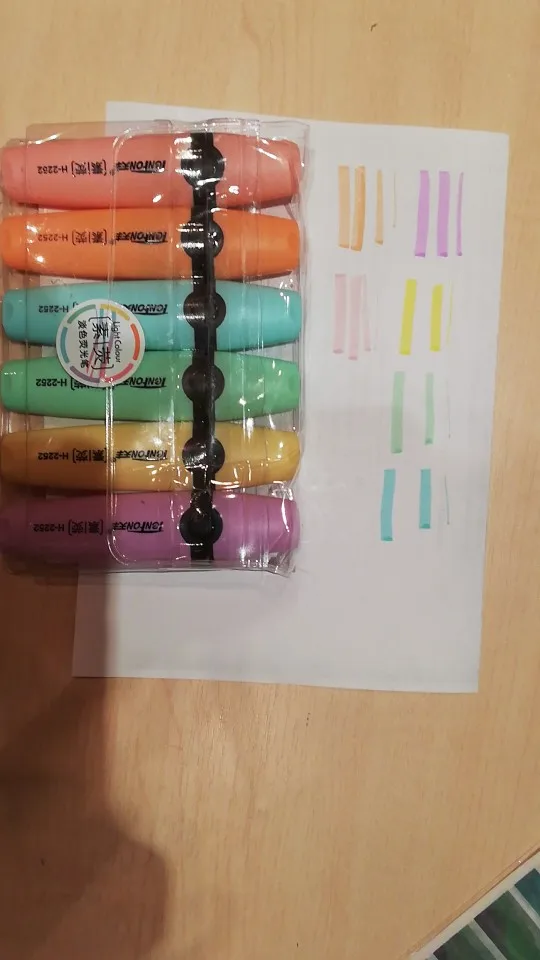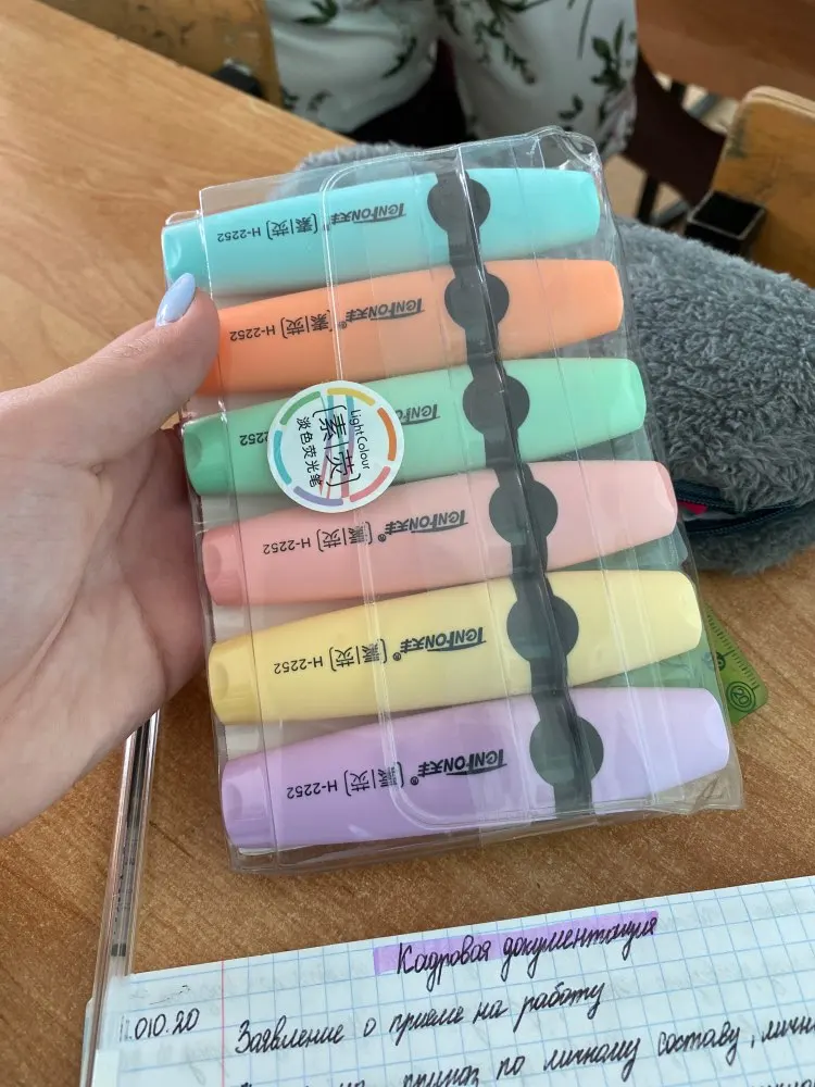 замечательное качество, продукт соответствует описанию, не пахнет, текстовыделители не сохнут, очень хорошо запакованы, повреждений нет, в целом, все супер. продавец отвечает быстро, доставка пришла за 12 дней.