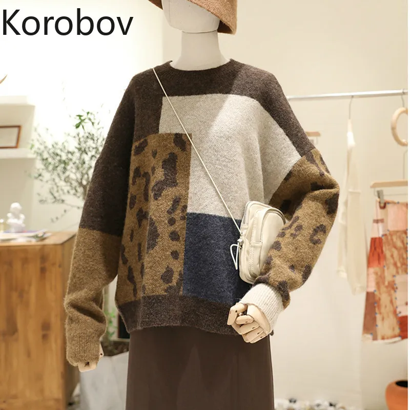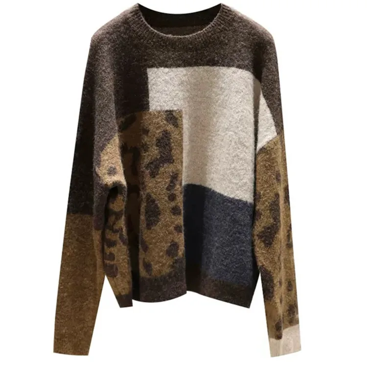Женский вязаный свитер с леопардовым принтом, пуловер с круглым вырезом и длинными рукавами в Корейском стиле, 79346