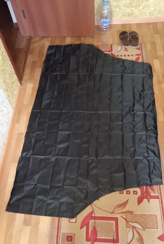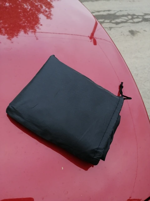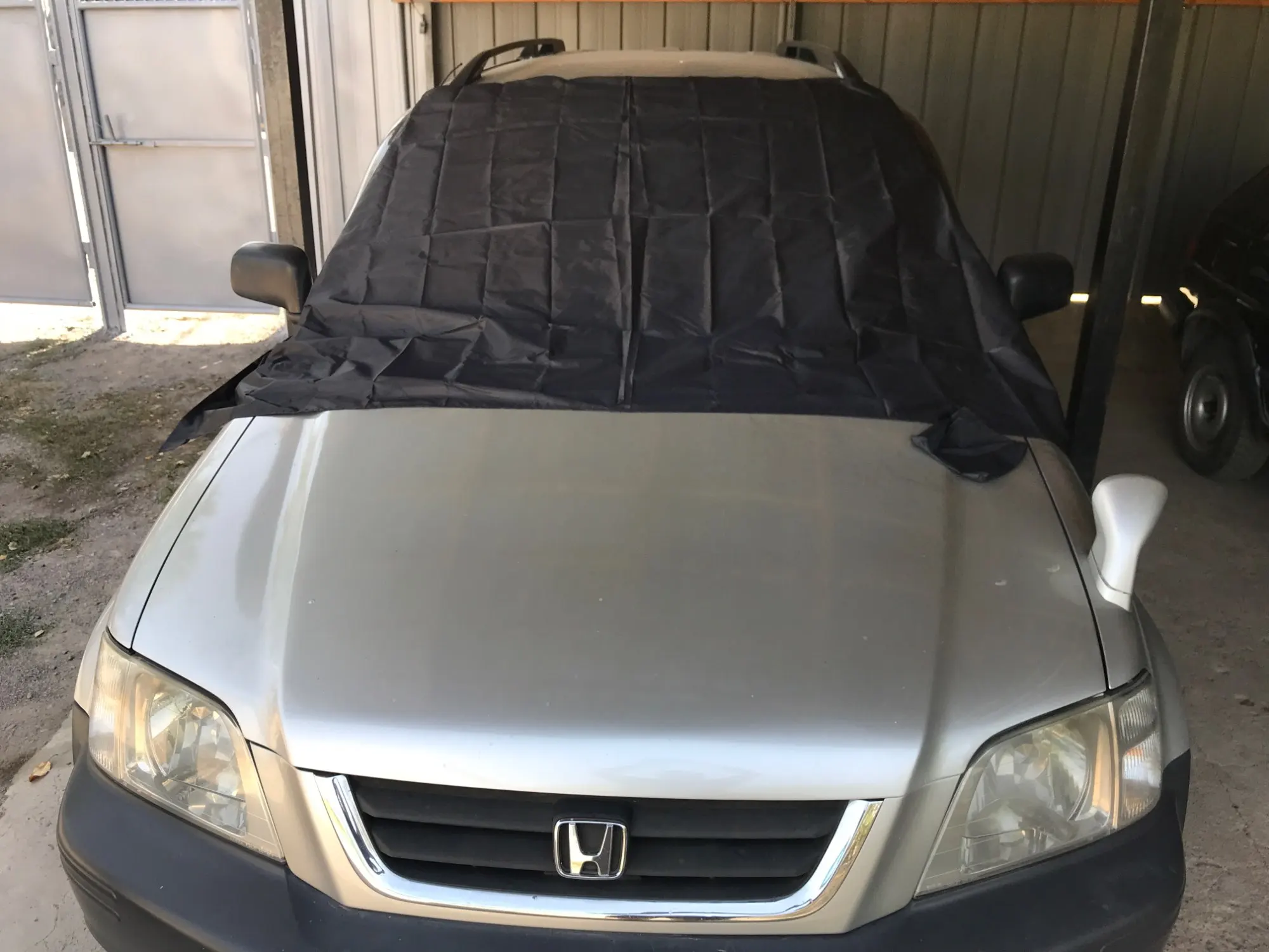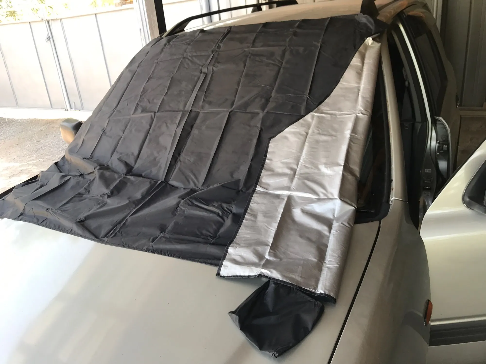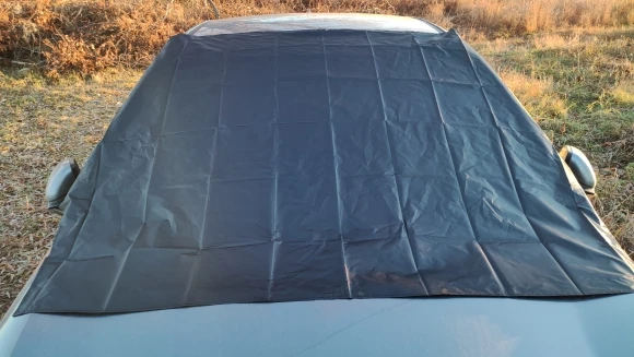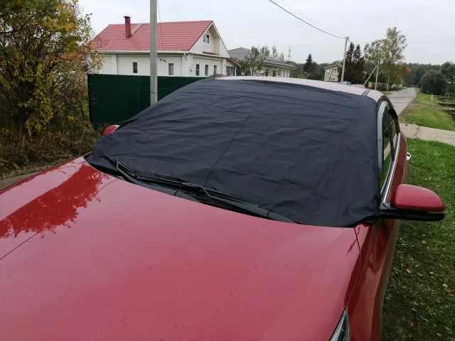 Брал на Фиат Альбеа. Закрывает полмашины: и на капот и на крышу с большим запасом и по бокам на двери тоже. Ради интереса примерили на Мерседес Спринтер (сами прикиньте разницу в размере лобовухи) - на него тоже почти подходит. А по качеству - ткань плащёвка. Одна сторона черная, другая серебристая.