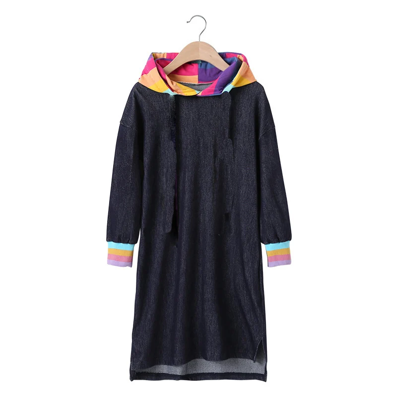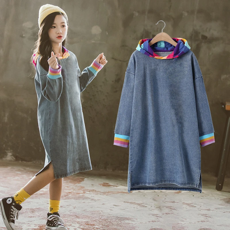 Джинсовое платье для девочек, на возраст 10-12 лет, с длинным рукавом, Радужная, осенняя, 2020