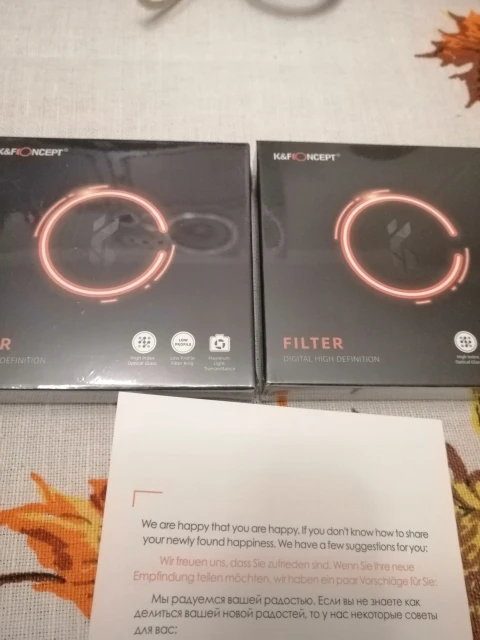Дошло до Пензы за 20 дней. Упаковка понравилась. Единственное чёрная коробка немного помялась при доставке, но сам фильтр ещё в пластиковой коробке, так что не страшно. Фильтр накручивается без проблем, но кольцо ходит немного туговато. Тестовую съёмки ещё не делал. Если что-то замечу, позже дополню отзыв. В целом покупкой доволен