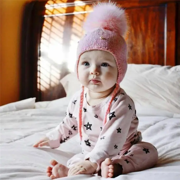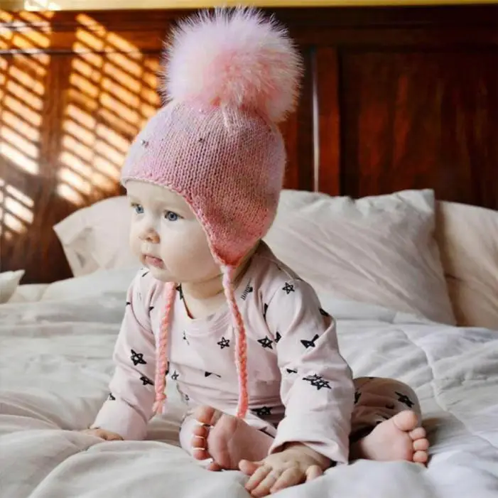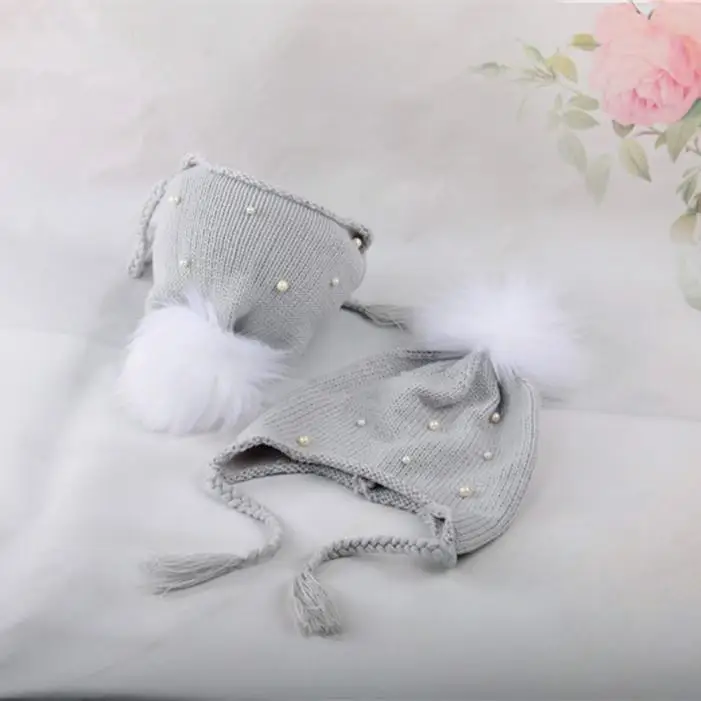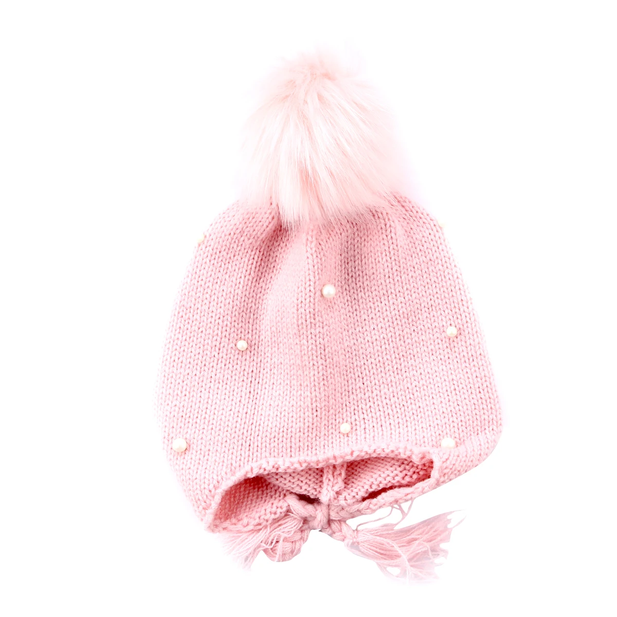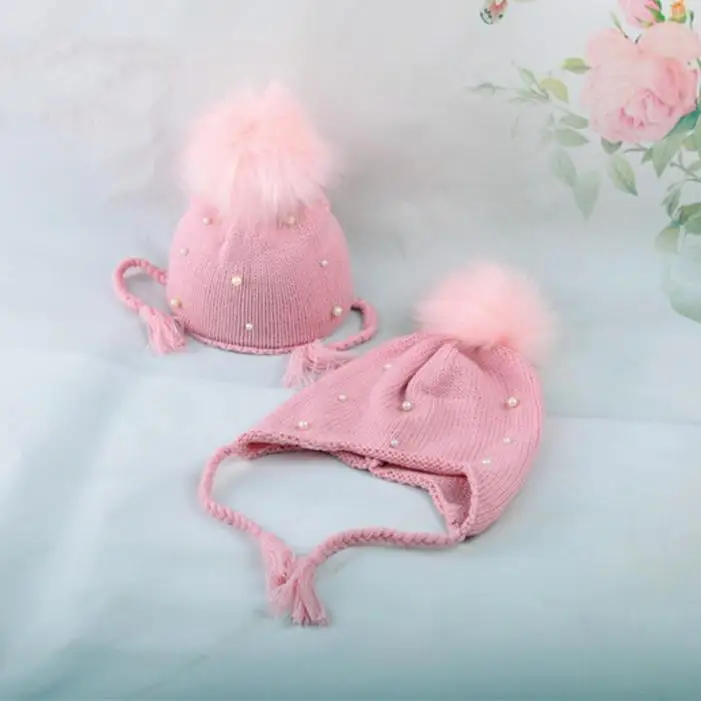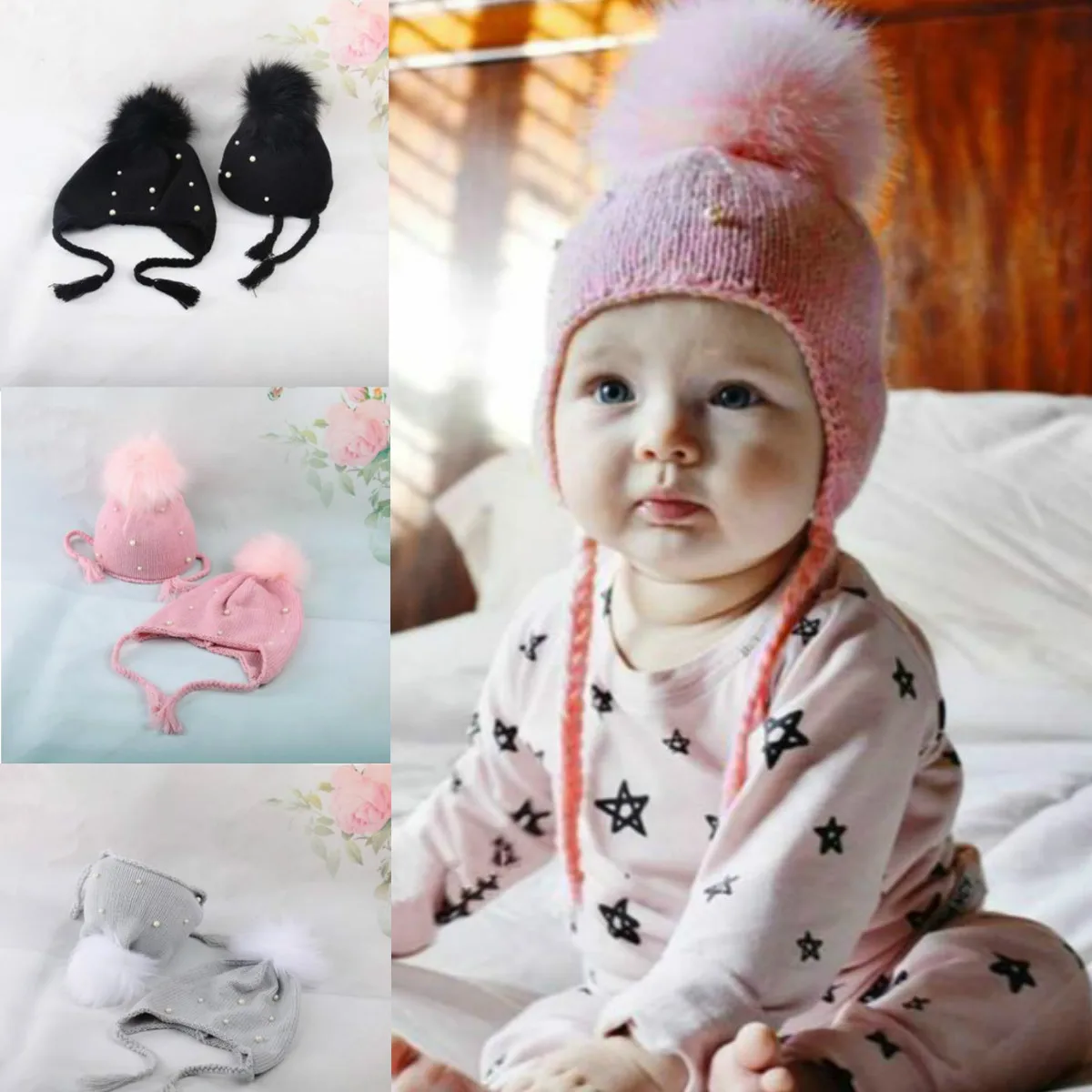 Шапка-бини с жемчугом для маленьких мальчиков и девочек, зимняя теплая вязаная шапка с меховым помпоном