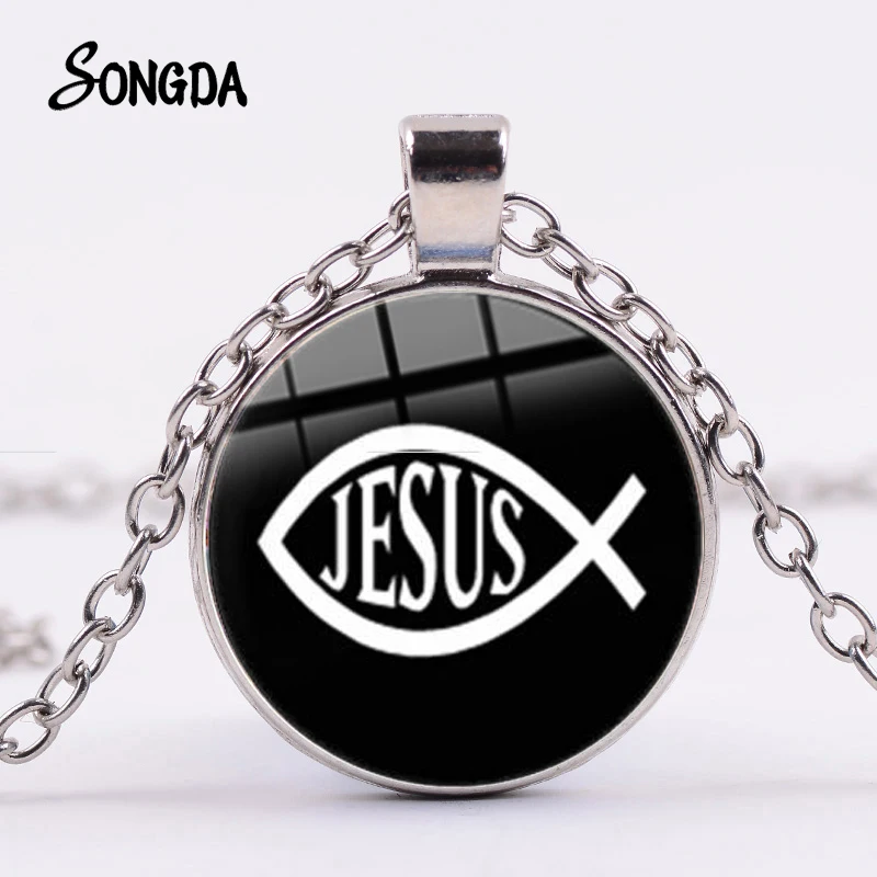 Новое христианское ожерелье с рыбками ихтусом и ихтусом, стеклянный драгоценный камень с надписью, очаровательная подвеска, религиозная культура, подарочные украшения