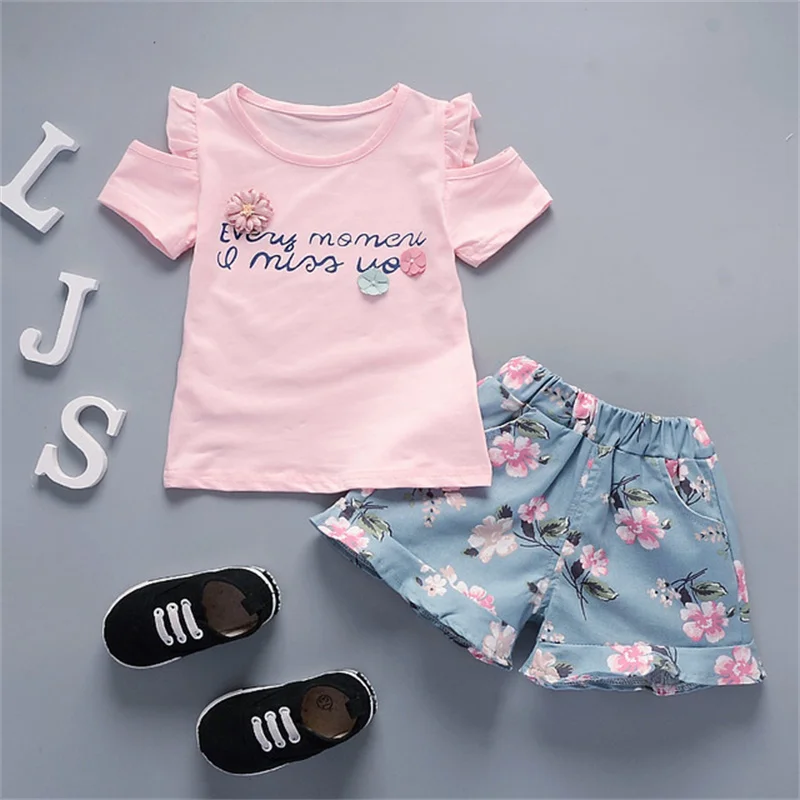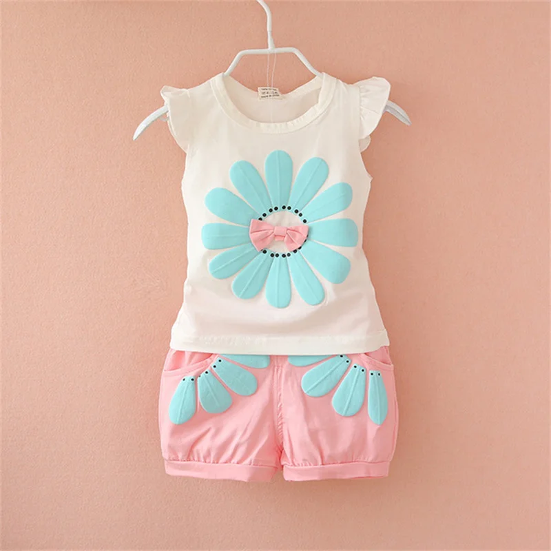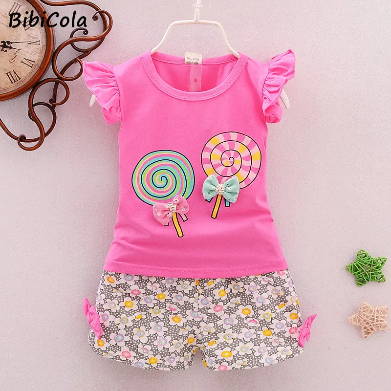 Комплекты летней одежды для маленьких девочек, хлопковые костюмы для новорожденных, топ с ярким рисунком + шорты, 2 шт. для маленьких девочек, модная спортивная одежда