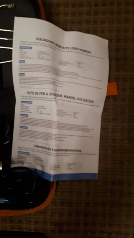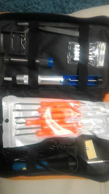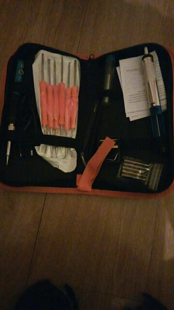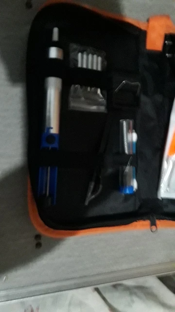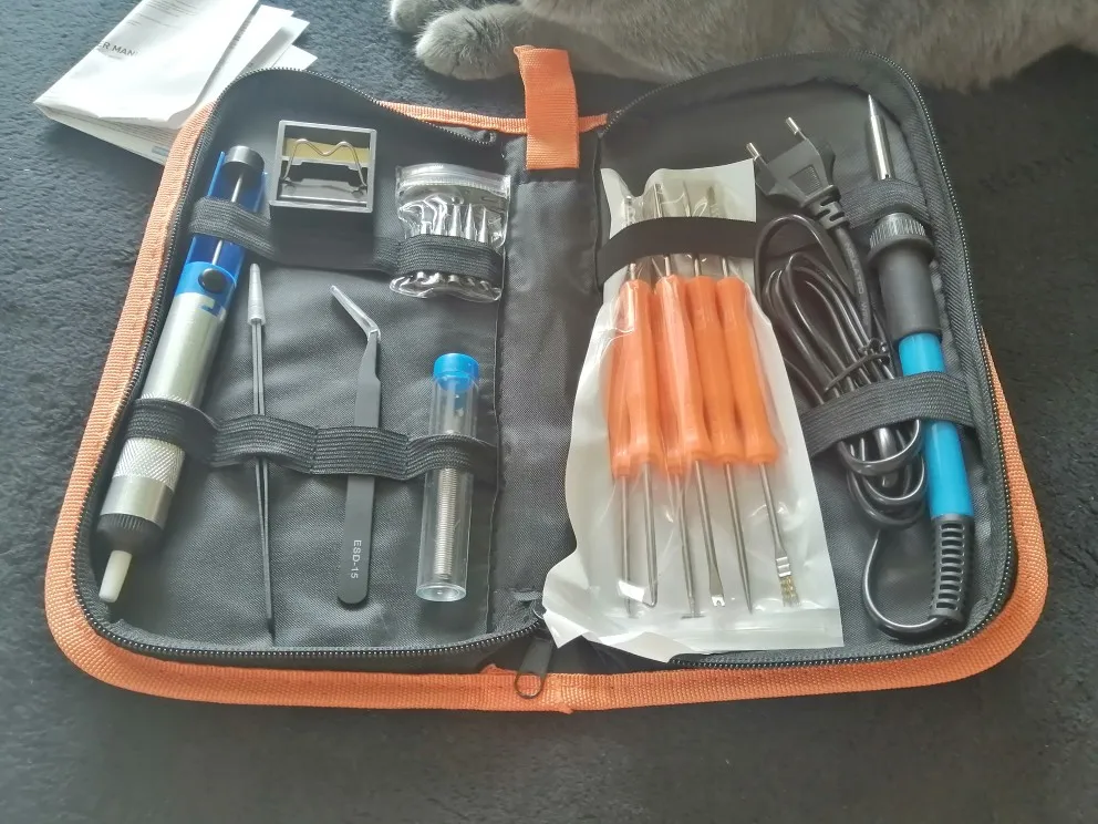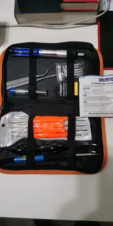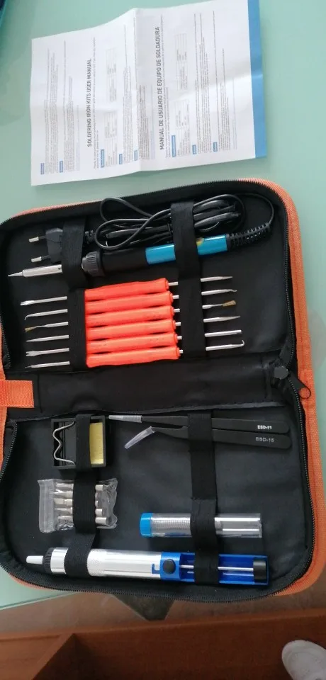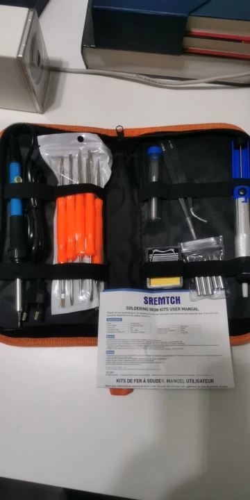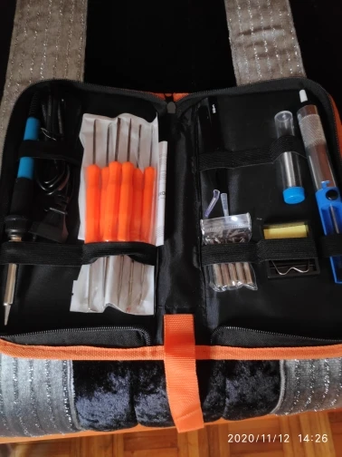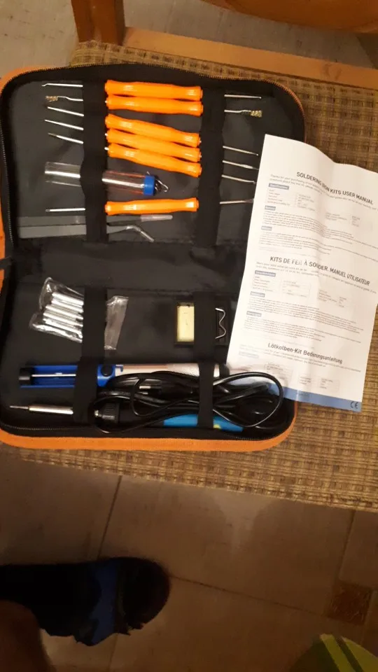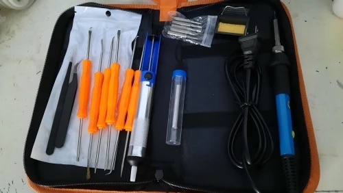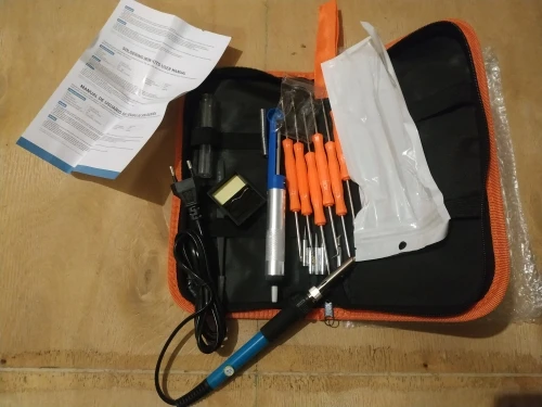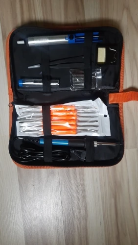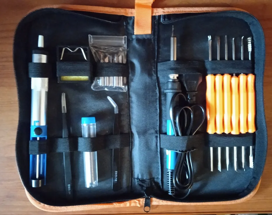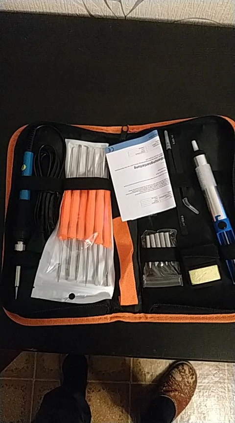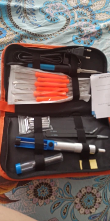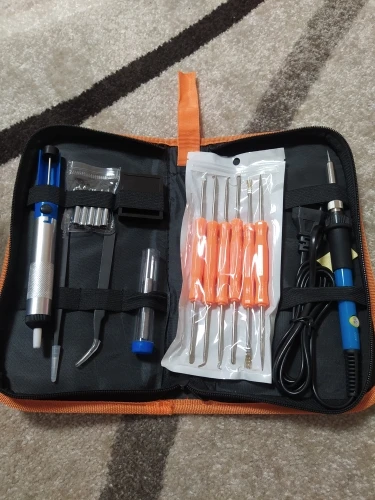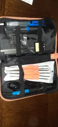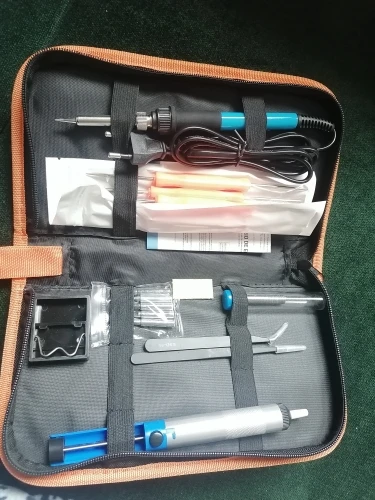 Хороший набор, из-за него и выбрал этот лот. Паяльник так себе, обычный. Но по цене набора - паяльник в подарок! Греется до 350 градусов минуты за 3-4. Подставочка маленькая очень, ожидал побольше и думал, она металлическая, а она пластиковой оказалась. "Ковырялки" удобные, давно такие искал. Пинцеты тоже качественные. Губки плотно прилегают друг к другу. Припой обычный. Сумка тканевая синтетическая. Думал, из кожзама, но полиэстер даже лучше, практичнее. Правда тонковат. Отсос... Не пробовал, но вроде работает как надо. Набор доехал за 4 дня Почтой России из Москвы в СПб. Отправляли пару дней. Если есть вопросы - задавайте, постараюсь ответить: SFS-LED@YA.RU. Набор рекомендую!
